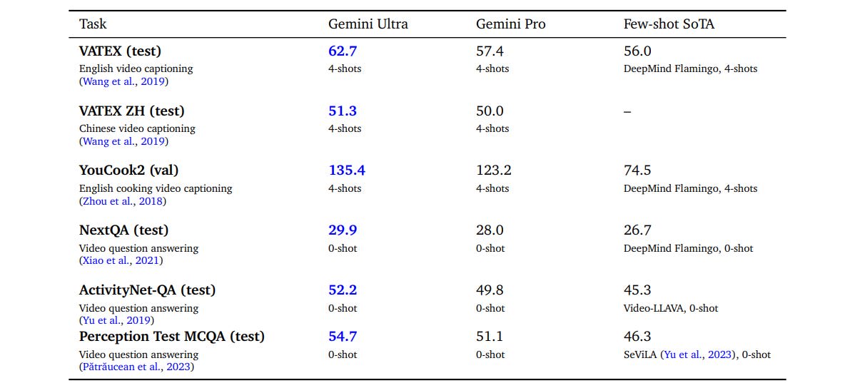 Eli Dourado: Here is the table of Gemini evals from the paper. Note that what is being released into the wild today is Gemini Pro, not Gemini Ultra. So don’t expect Bard to be better than ChatGPT Plus just yet. Looks comparable to Claude 2.