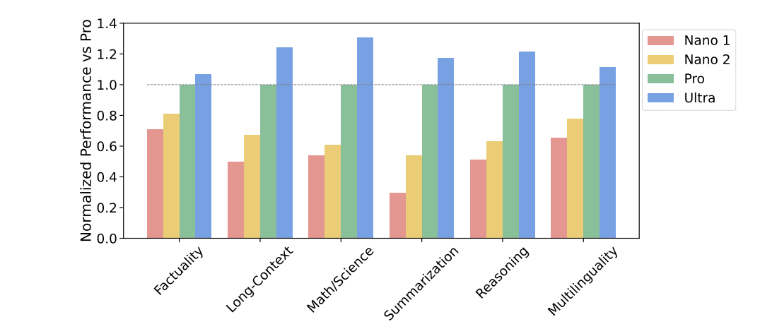 This graph reports relative performance of different size models. We know the sizes of Nano 1 and Nano 2, so this is a massive hint given how scaling laws work for the size of Pro and Ultra.