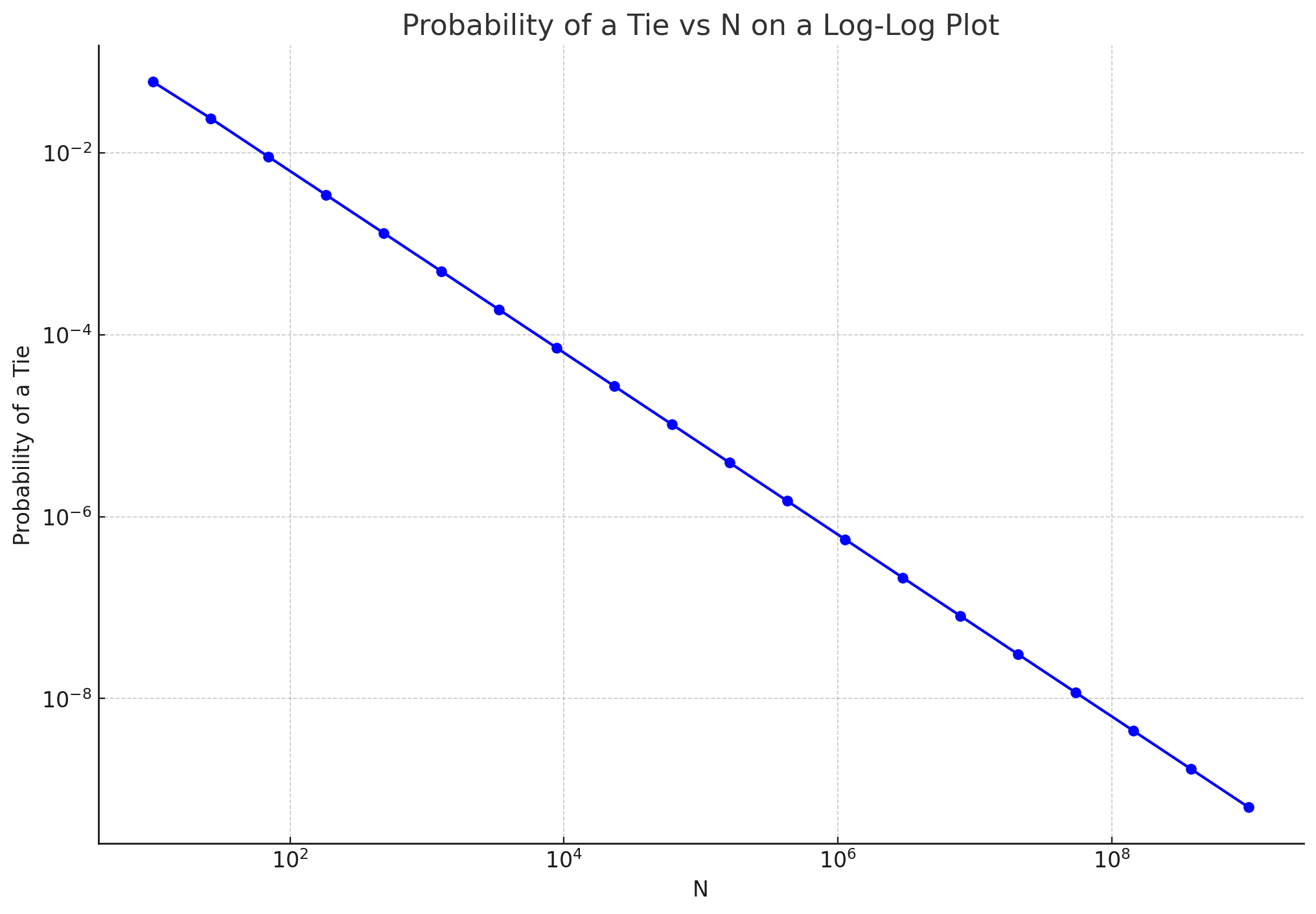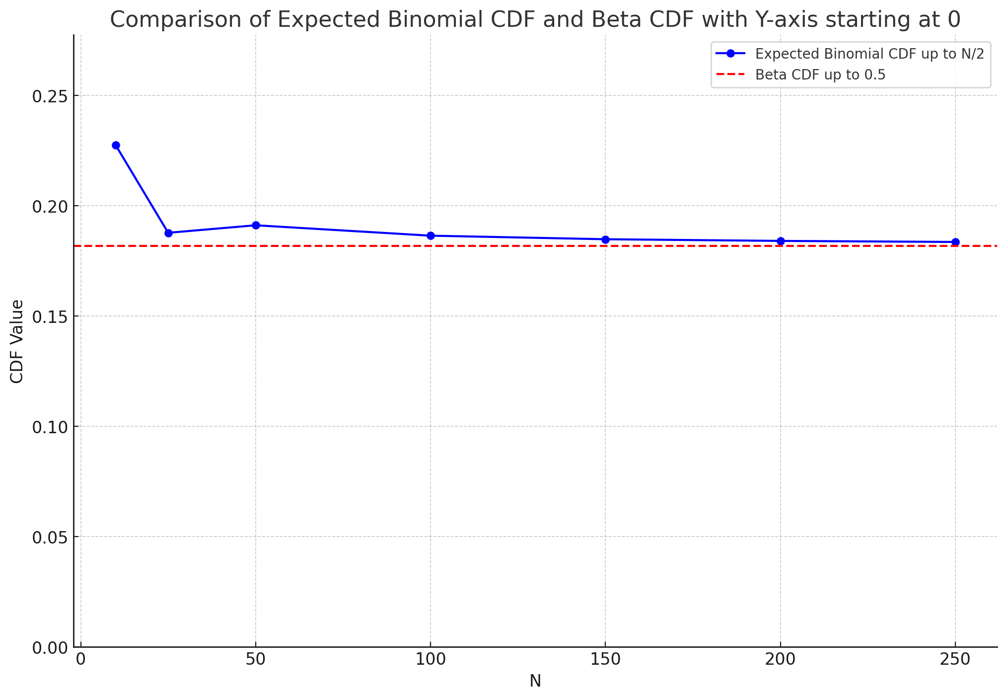 For the non-tiebreaker cases, you have to evaluate and , again as an expectation over . This is where I’ll use the approximation that . Then the expected probability that is just the CDF of the beta distribution up to 0.5. This approximation is valid for values of above a couple hundred:
