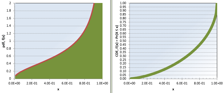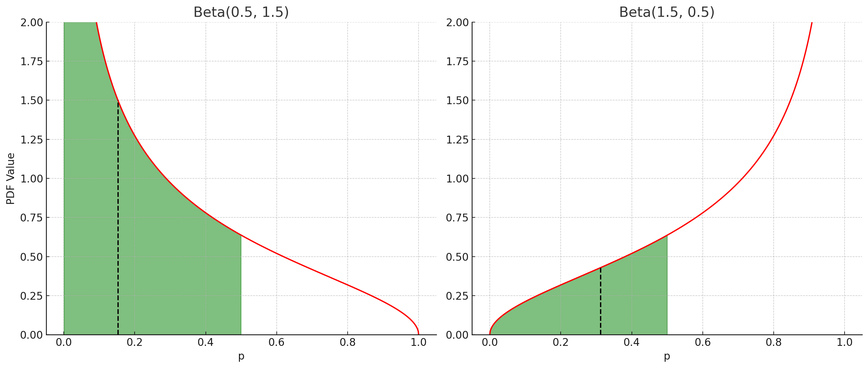 Specifically, we want the expectation of over the interval (0, 0.5). That’s shown by the dotted lines in the plots below. You can roughly see that each of them divides the green area in half. For the case where you chose red, the expected fraction of players who die (conditional on a red majority) is 0.1527. If you chose blue, it’s 0.3120, or about twice as many.