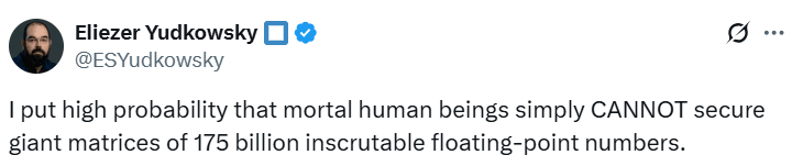 But in 2025, Yudkowsky appears to believe that the current threat absolutely comes from giant inscrutable matrices. And as far as I can tell, he has become very pessimistic about any kind of robust “alignment”.