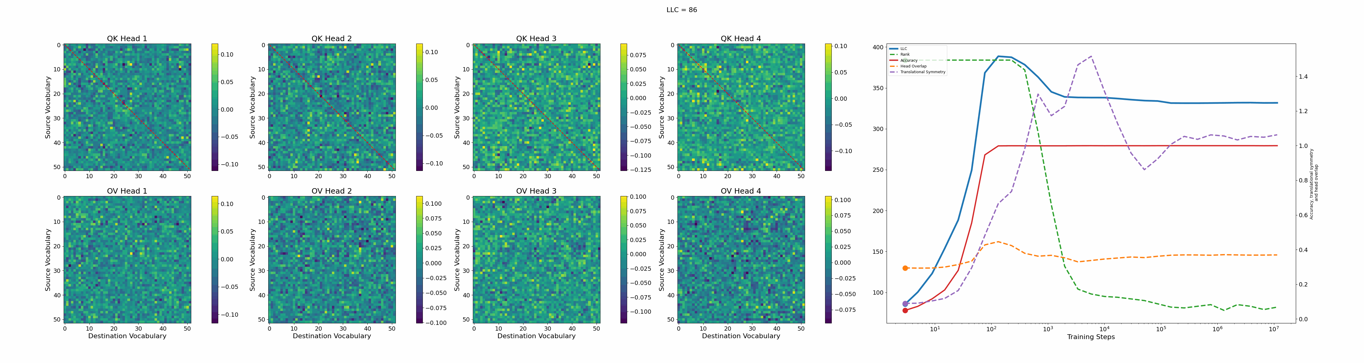 Here too, the LLC decrease happens during the training steps when the OV circuits specialize for each head and the QK circuits develop a more distinctly positive region above the diagonal. The new measures we introduce, the translational symmetry and the head overlap, manage to capture these changes as well. The Rank is constant throughout training.