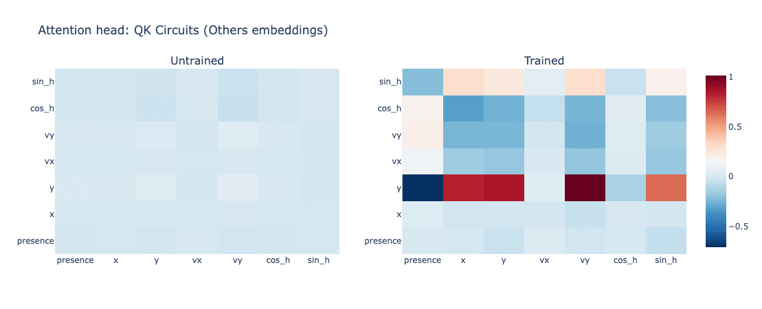 vx,vy) suggests a collision risk.Strong correlations in Others embedding QK circuit show that the agent reacts to nearby vehicles. (unverified claim, same reason as above)