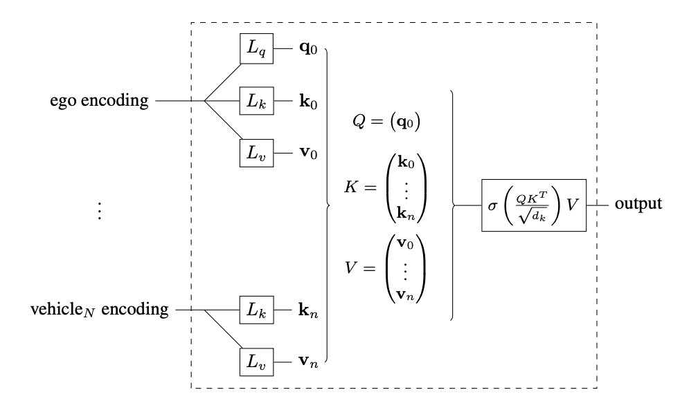 Essentially, a single query Q = [q0] and a set of keys K = [k0,...,kN] are emitted by doing linear projections on the state of the environment. Here, N is the number of vehicles including the agent’s vehicle.