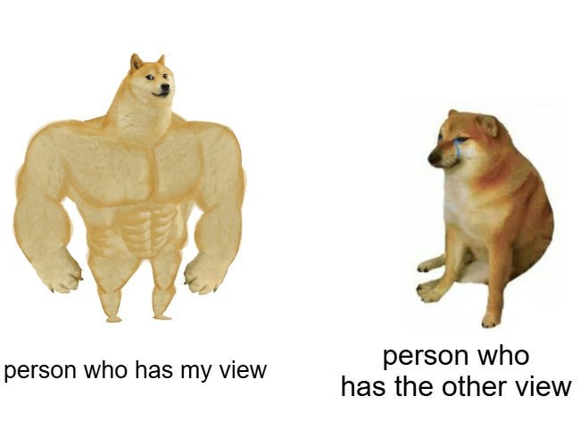 In a recent post titled The Memefication of Thought (it’s a good post and you should read it), Bentham’s Bulldog railed against the modern tendency to dismiss serious arguments with inane memes so as to avoid thinking about it. He had some pretty good memes of his own, such as the classic Swole Doge vs. Cheems: