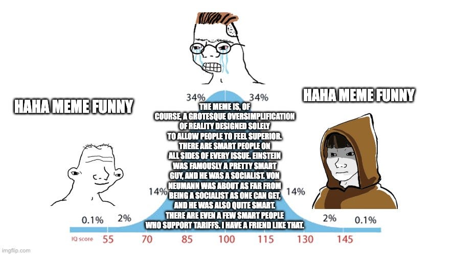 This is pretty uncharitable to the midwit meme (although I don’t blame him for not taking it very seriously). As I said in Bentham’s comments section, the archetypal midwit isn’t merely just “guy who has position I disagree with”. It’s specifically “guy defending the position I disagree with in an intense amount of detail”, usually in the format of a stream-of-consciousness monologue that is clearly irrational. In a strange way, it’s approving of the low IQ section of the bell curve; it’s specifically a meme that argues against overthinking.