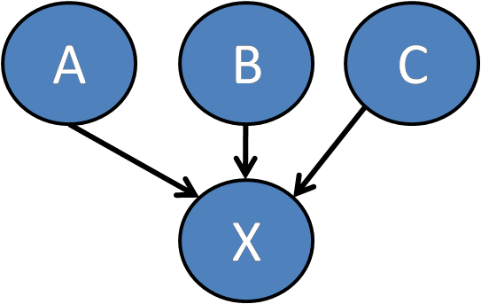 There is a second, more subtle flaw in the belief network paradigm. A belief network is defined based on a graph which has one node for each data variable. This is fine, if you know what the correct variables are. But very often the correct variables are unknown; indeed, finding the correct variables is probably the key problem in learning. Once you know that the critical variables are mass, force, and acceleration, it is almost trivial to determine the relation between them. As an example, consider a system composed of three variables A,B,C and X. The unknown relationship between these variables is X~F(A+B+C), where F is some complex distribution that depends on a single parameter. Now, a naïve representation will yield a belief network that looks like the following: