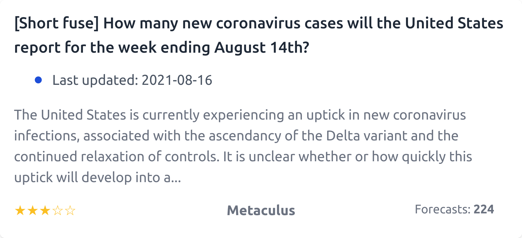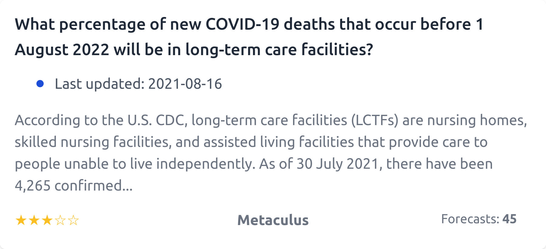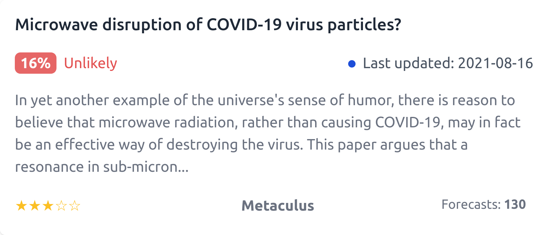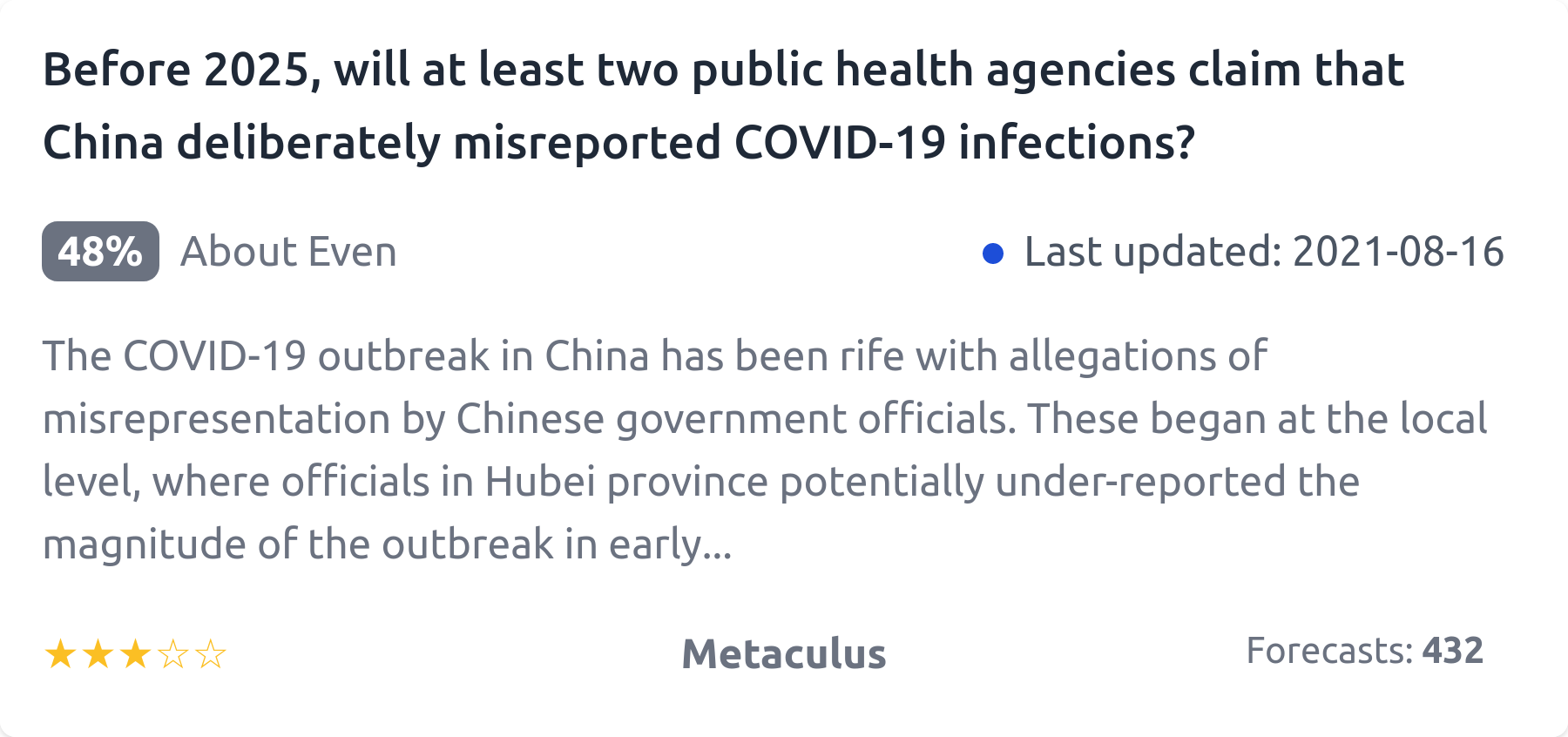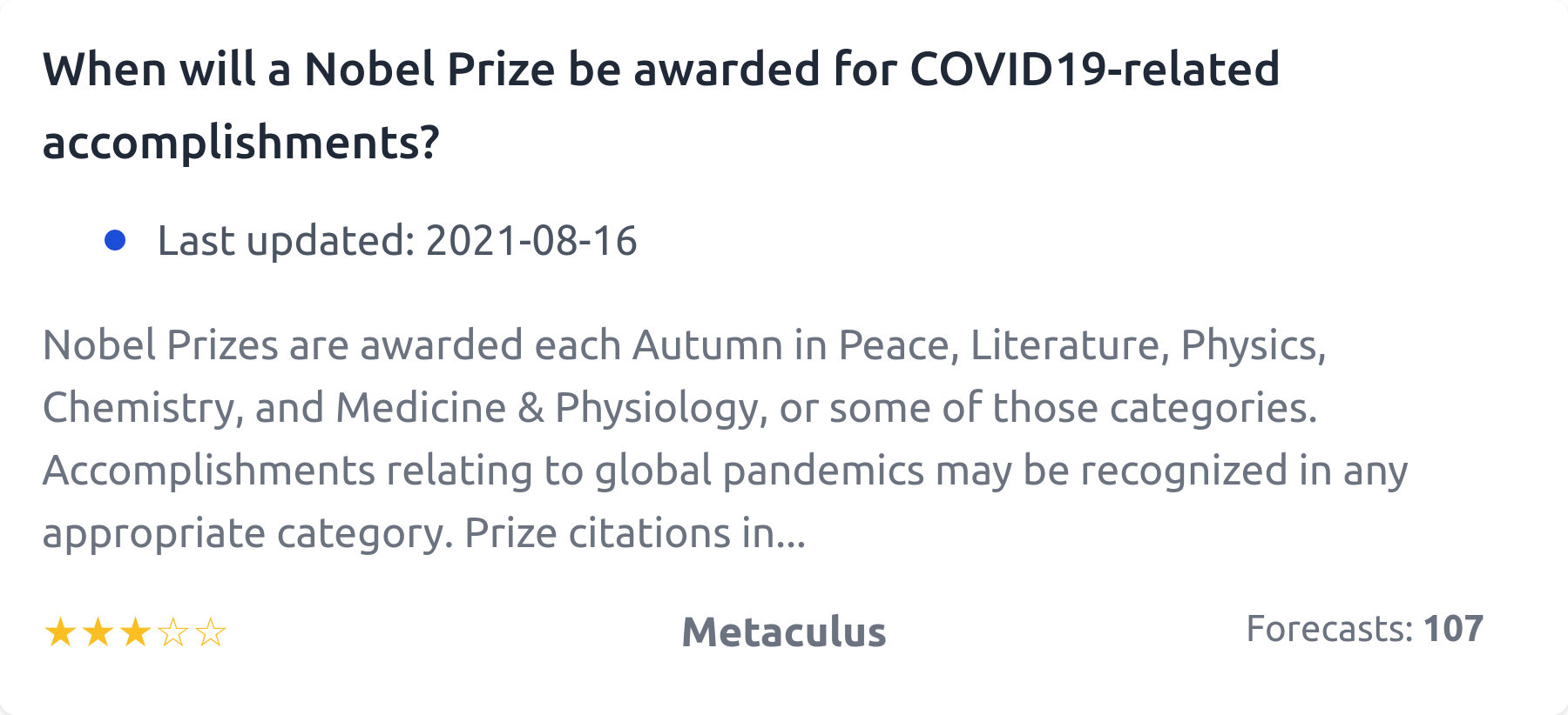 These are taken from Metaforecast, and are provided without comment. To do this yourself, make a search query on Metaforecast, then click on “Capture” on the top right corner, then on “Capture image and generate code”.