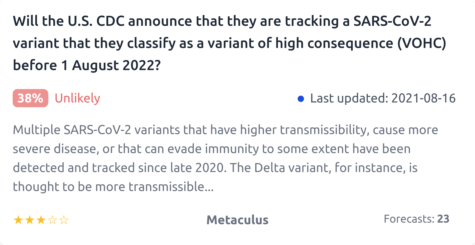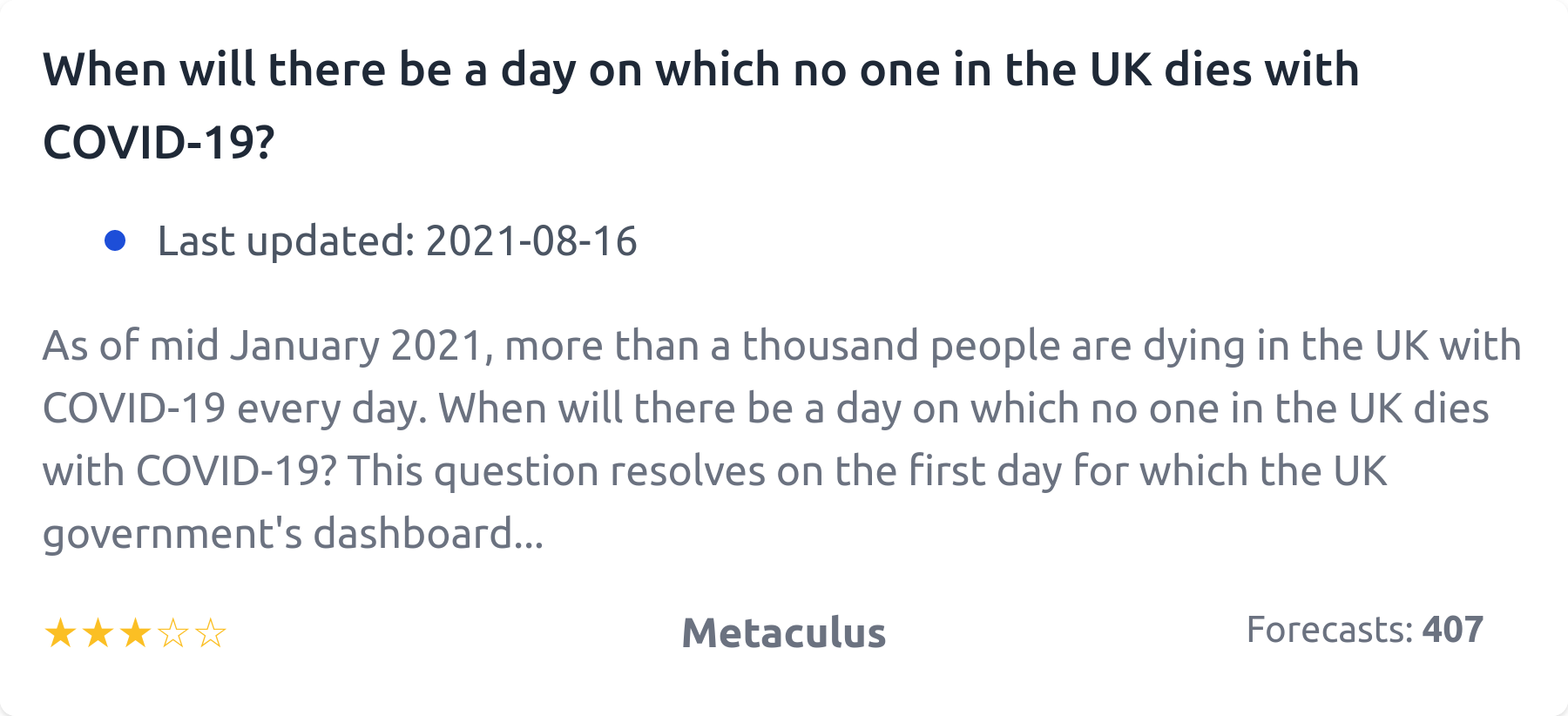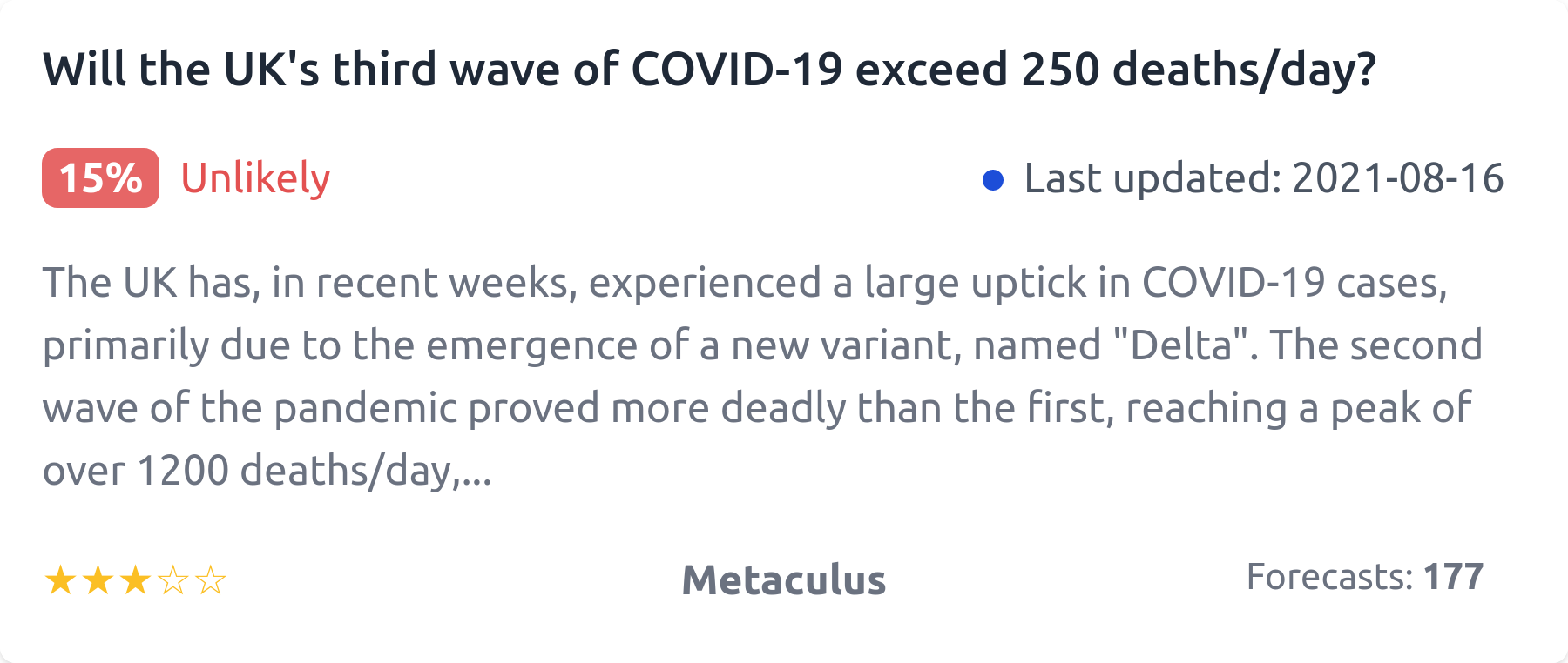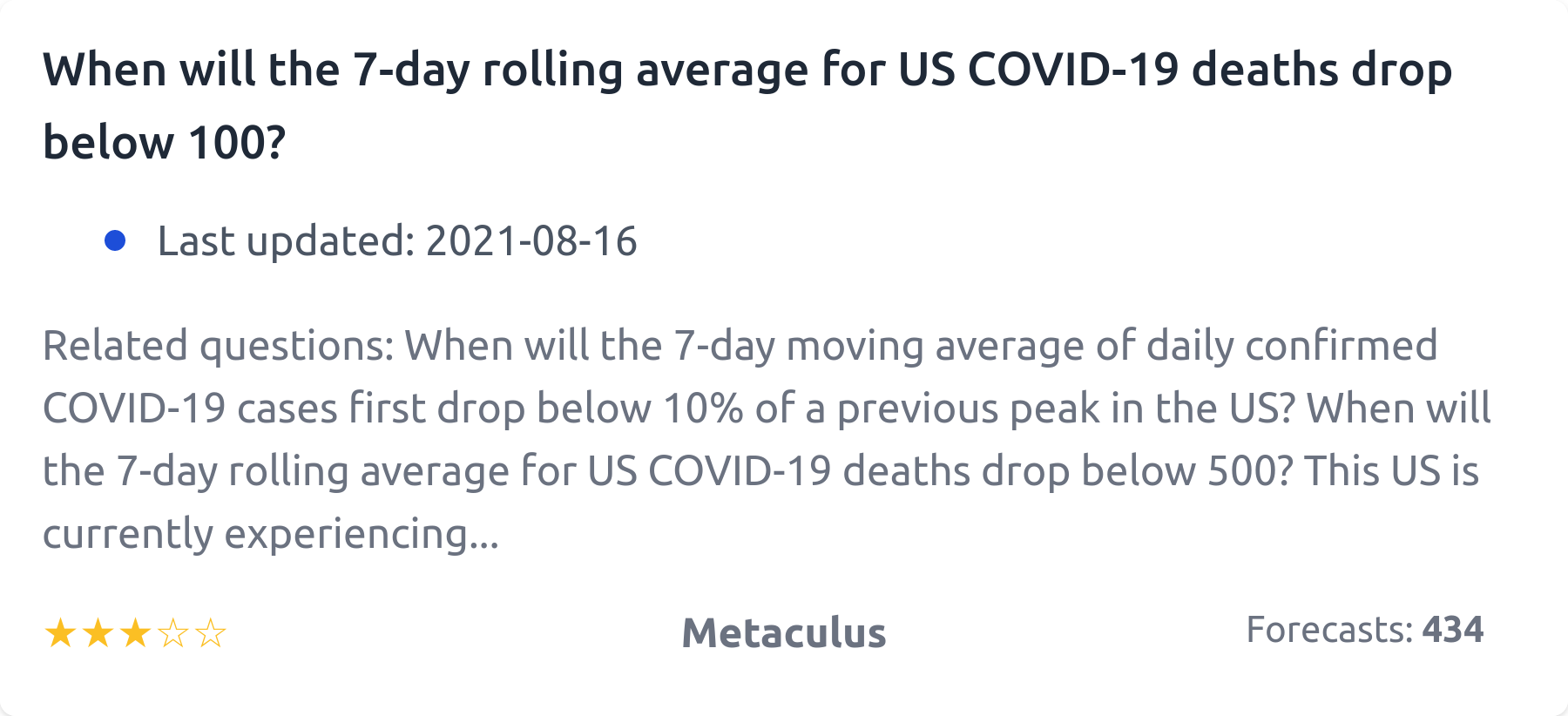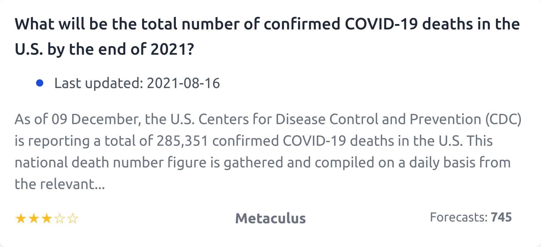 These are taken from Metaforecast, and are provided without comment. To do this yourself, make a search query on Metaforecast, then click on “Capture” on the top right corner, then on “Capture image and generate code”.