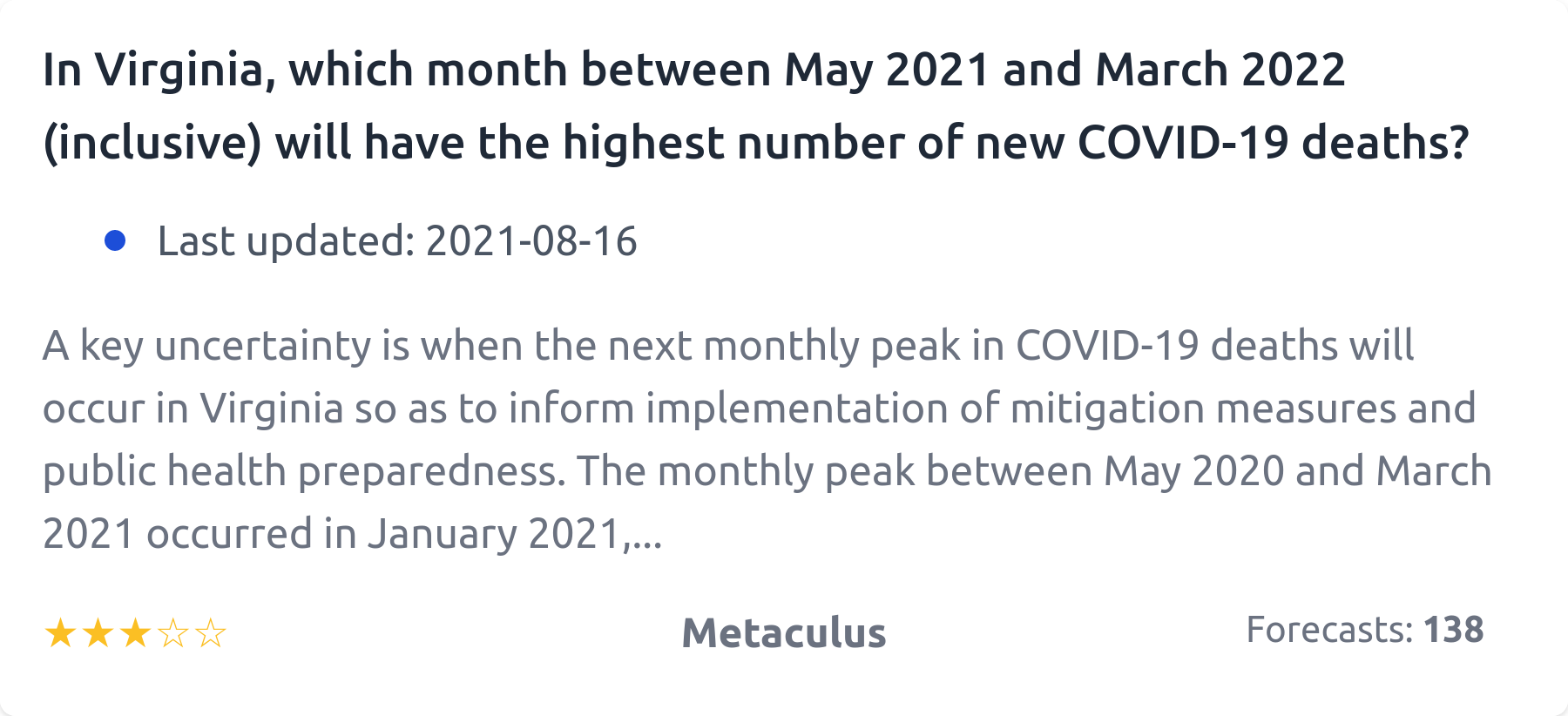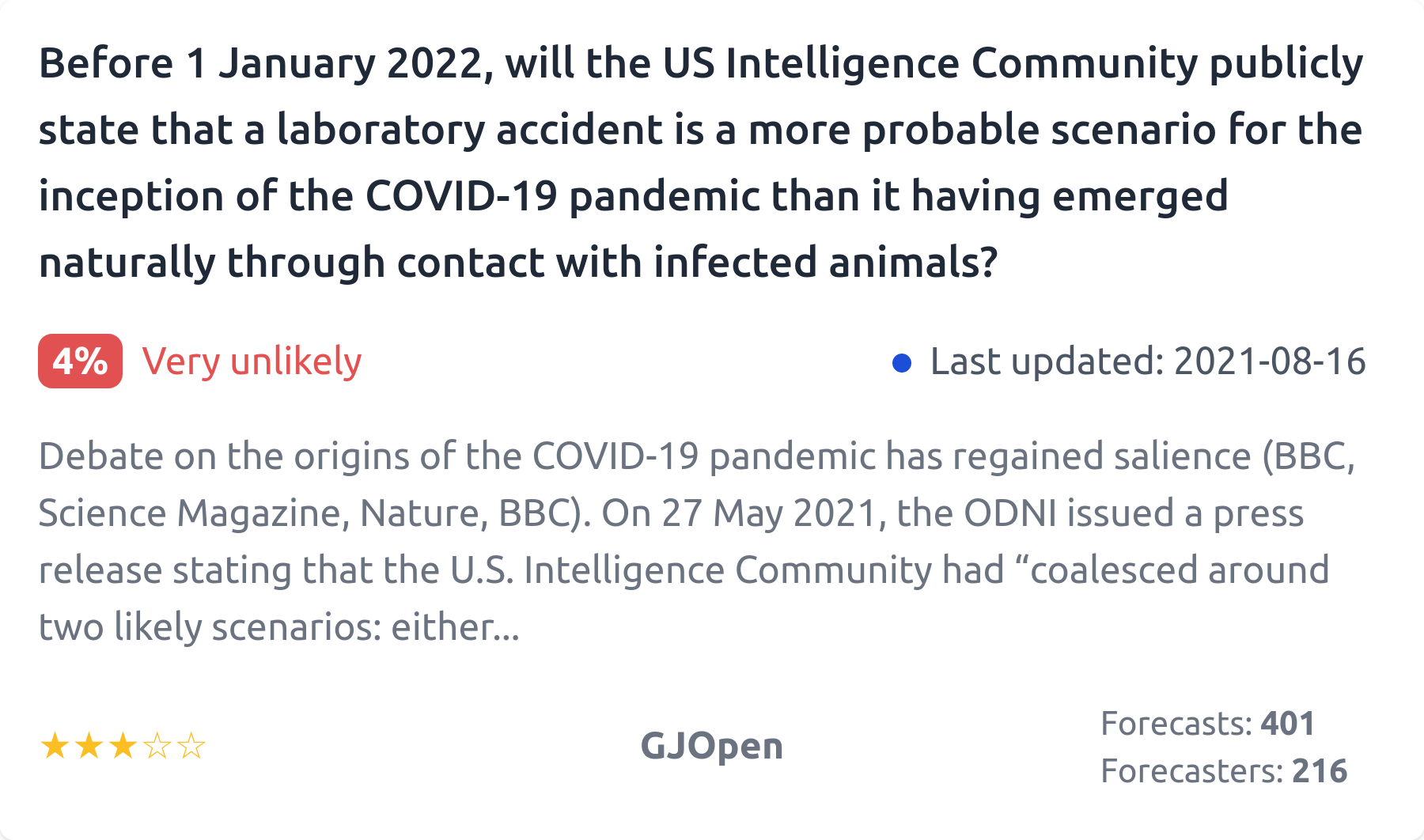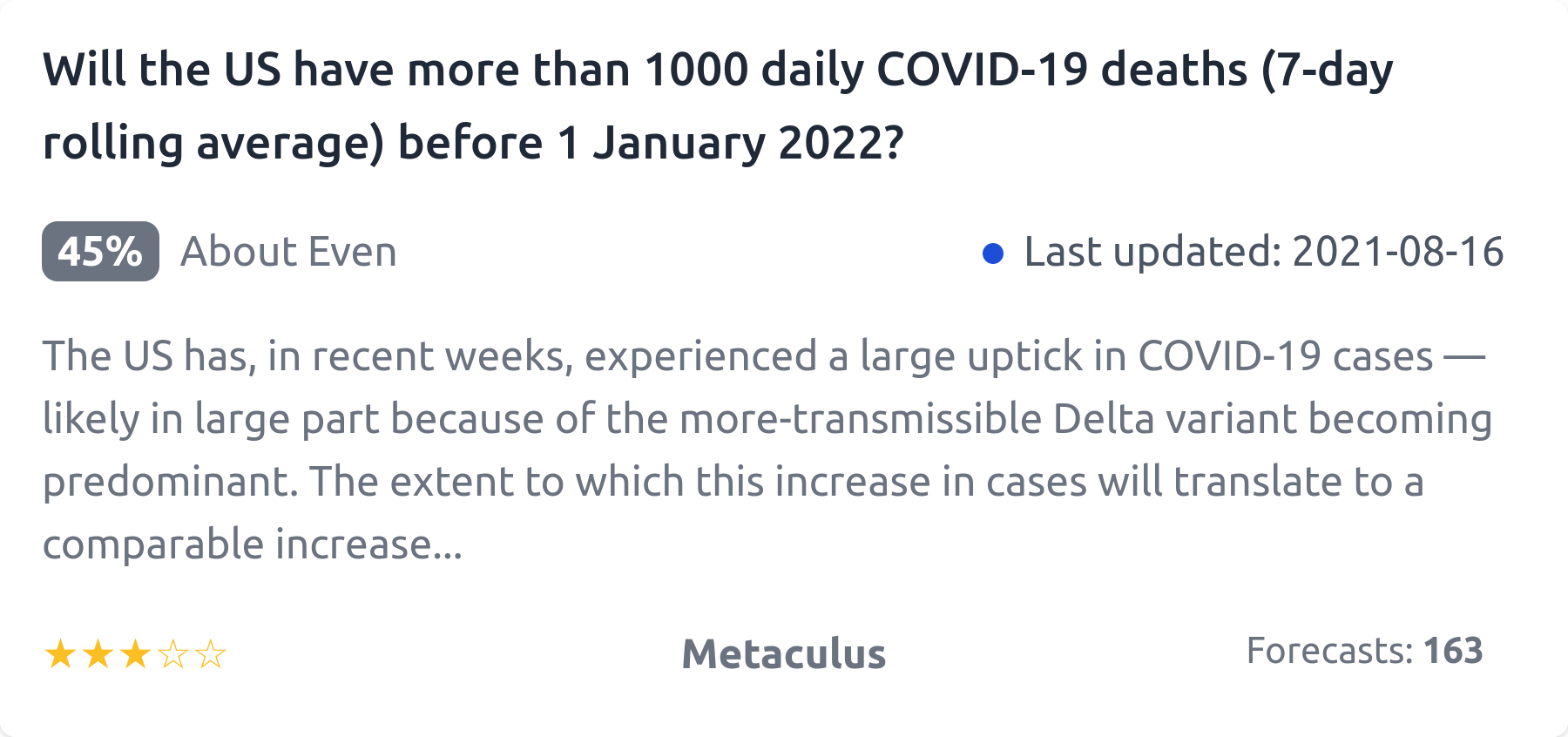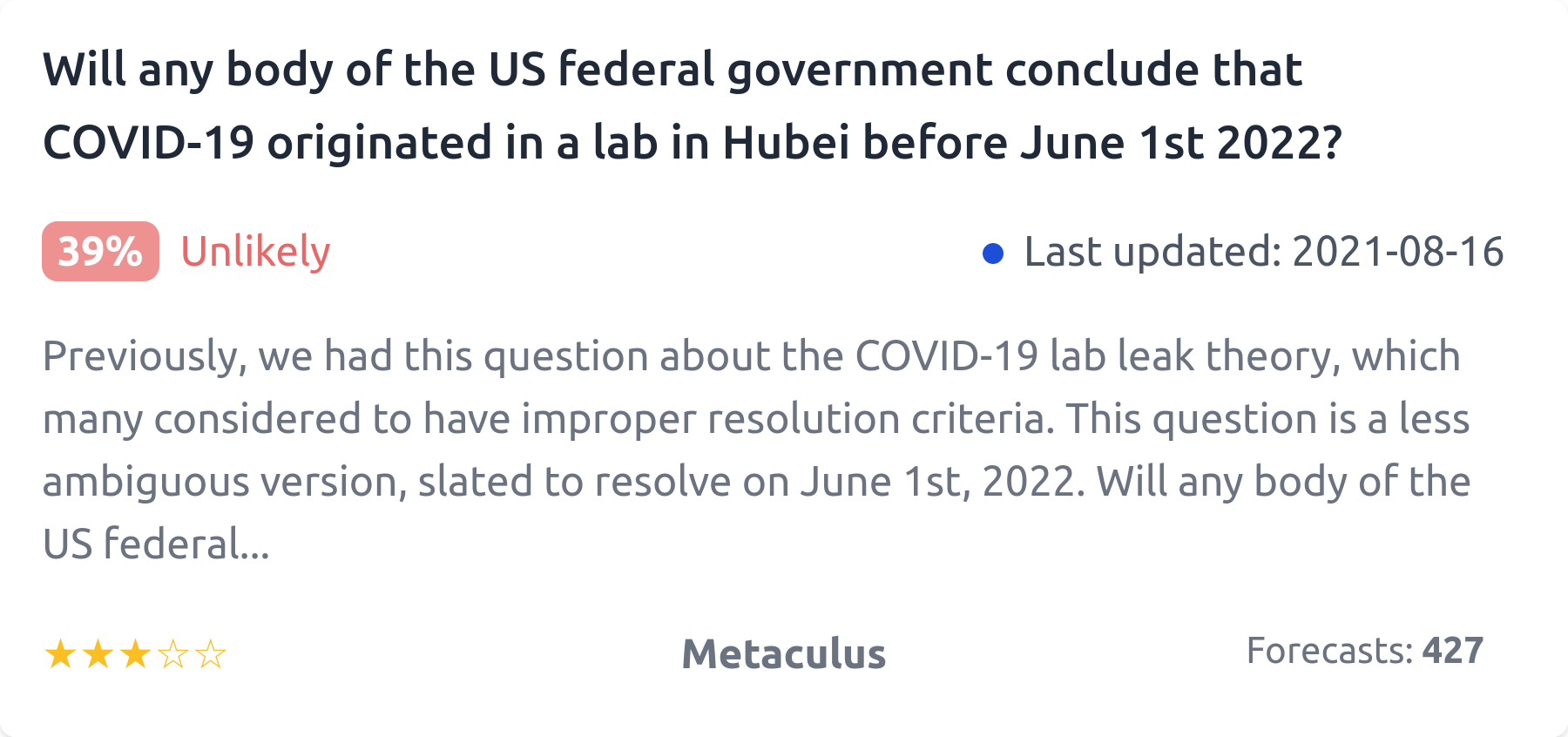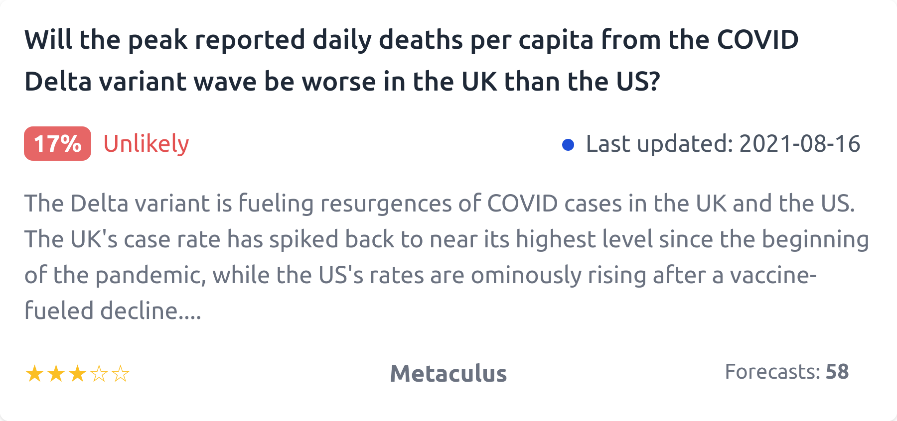 These are taken from Metaforecast, and are provided without comment. To do this yourself, make a search query on Metaforecast, then click on “Capture” on the top right corner, then on “Capture image and generate code”.