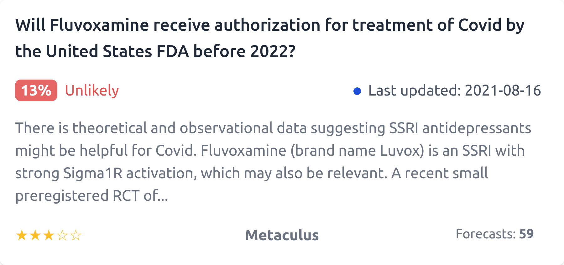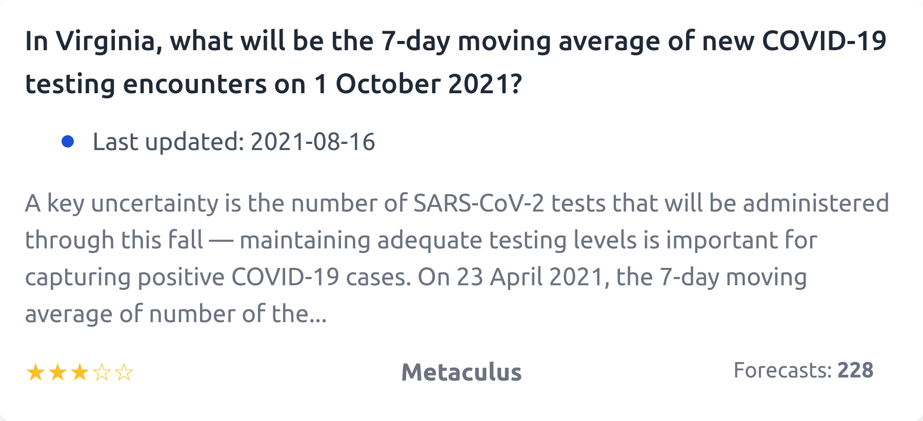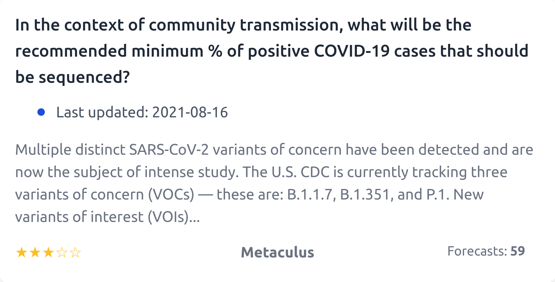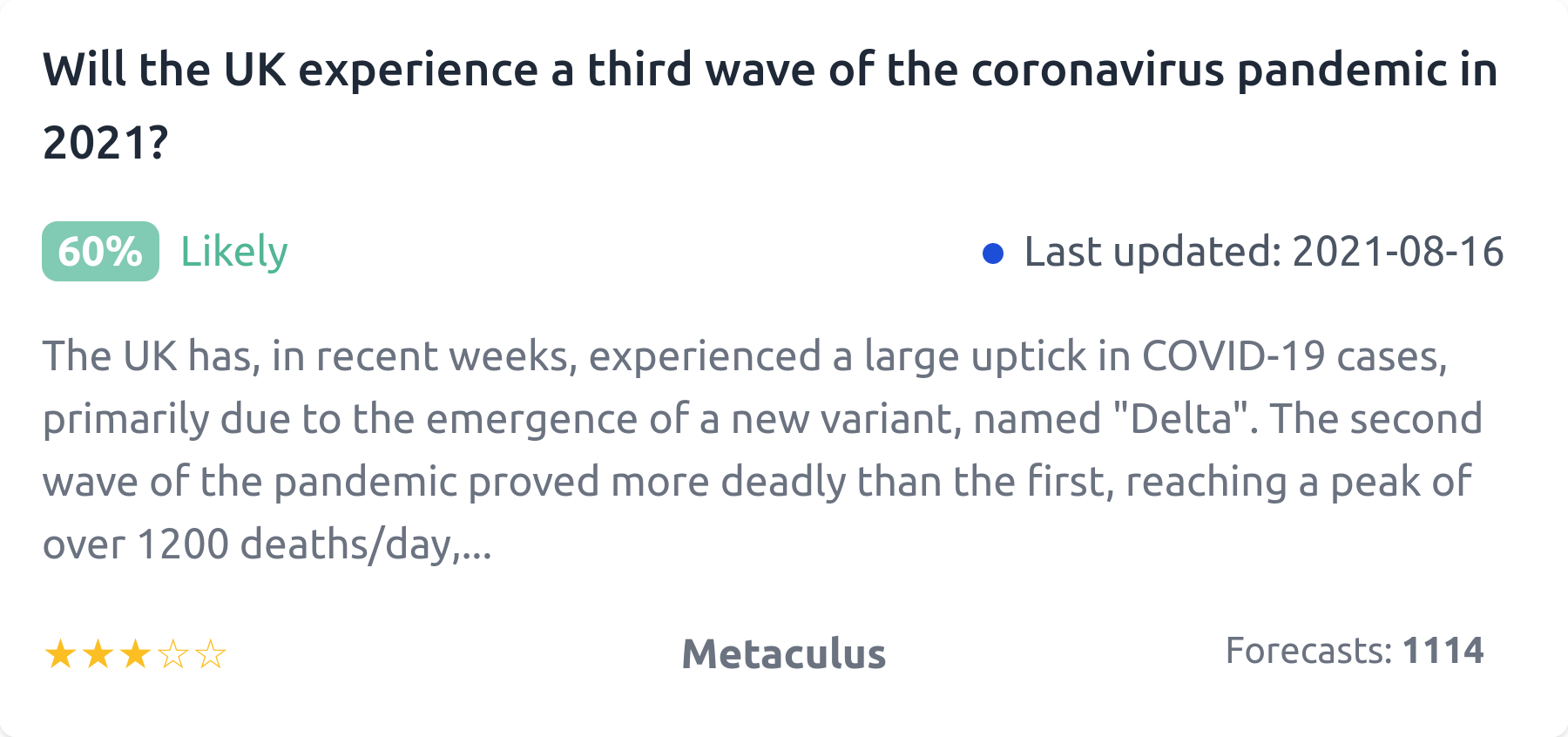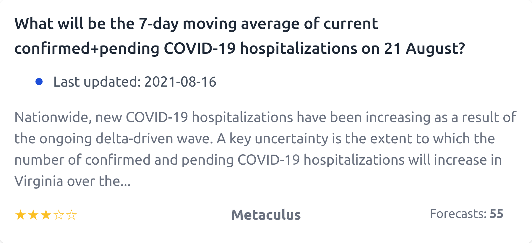 These are taken from Metaforecast, and are provided without comment. To do this yourself, make a search query on Metaforecast, then click on “Capture” on the top right corner, then on “Capture image and generate code”.