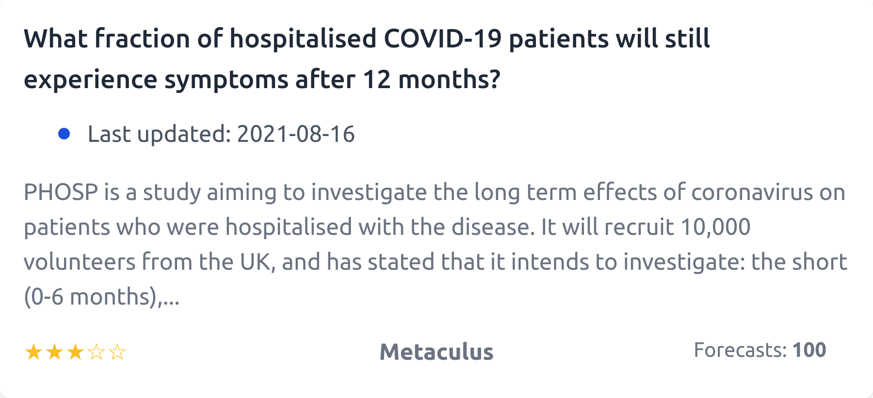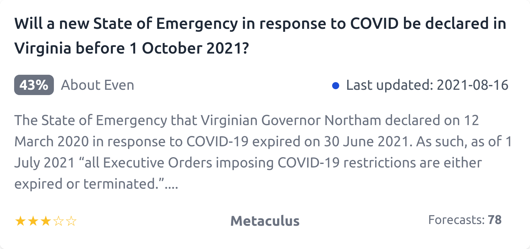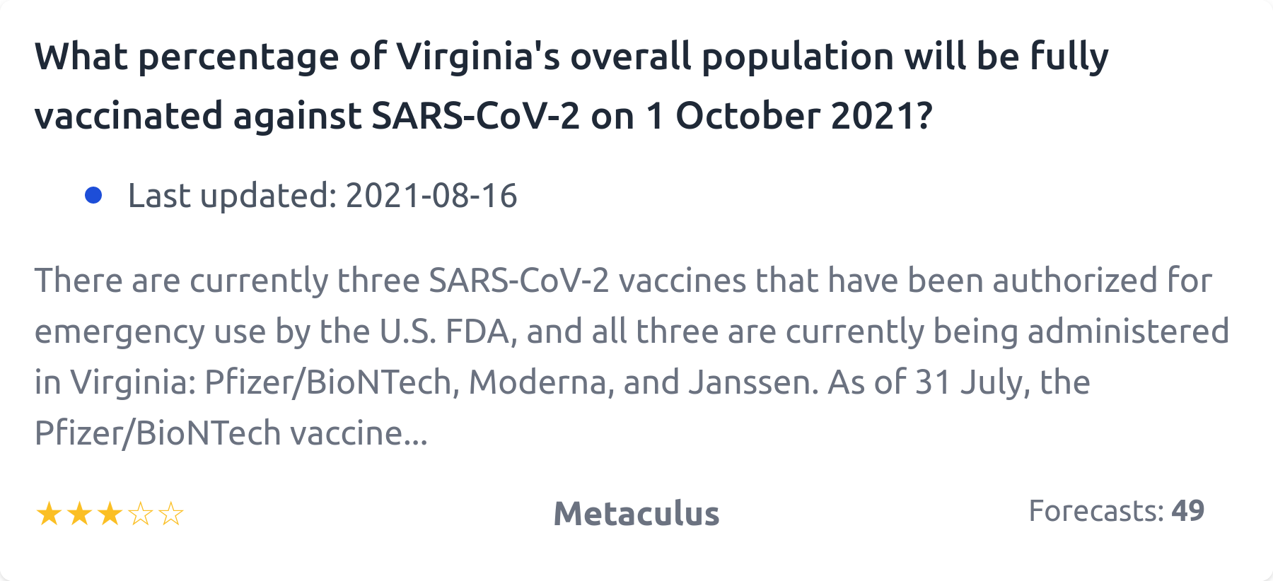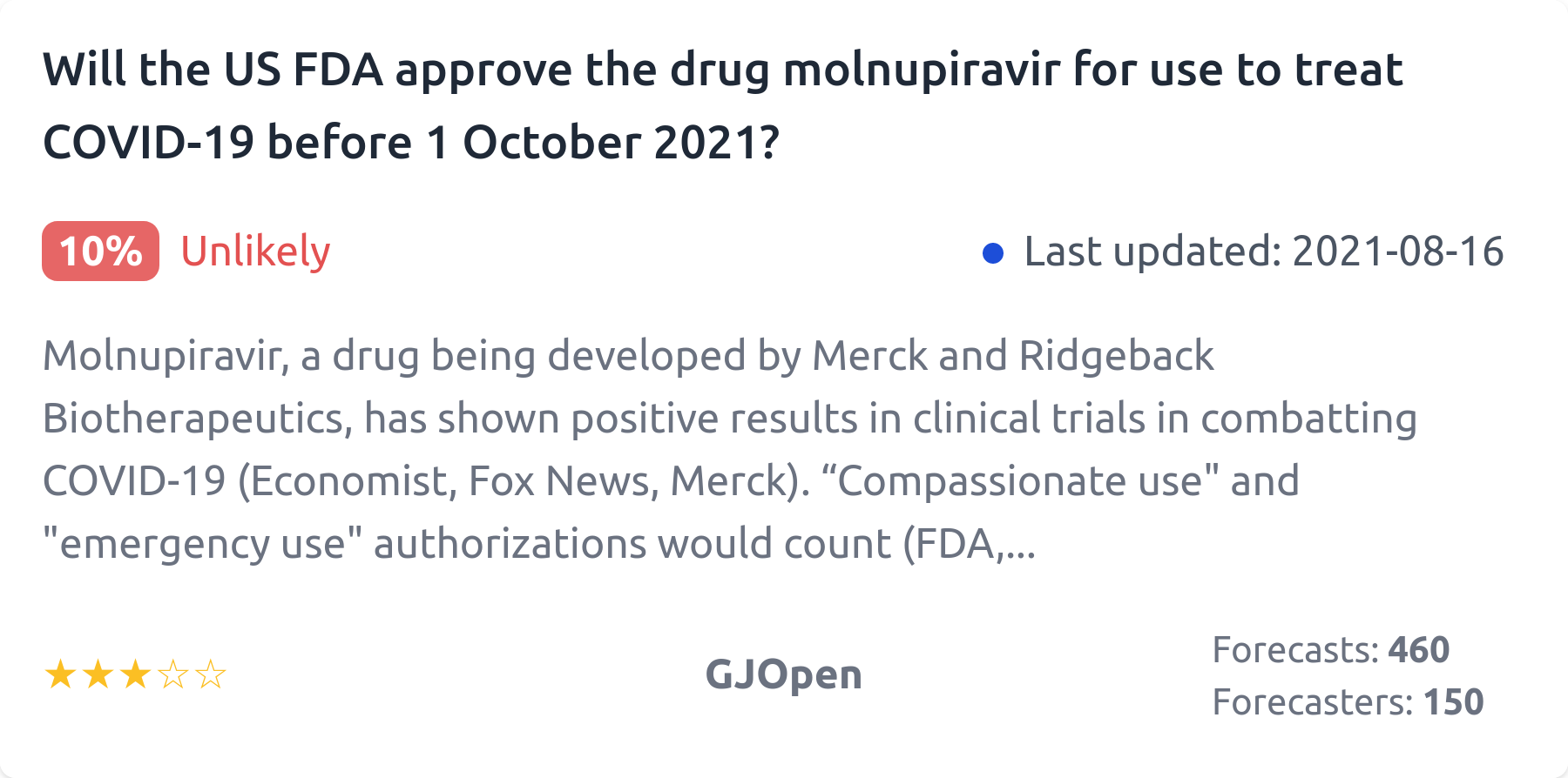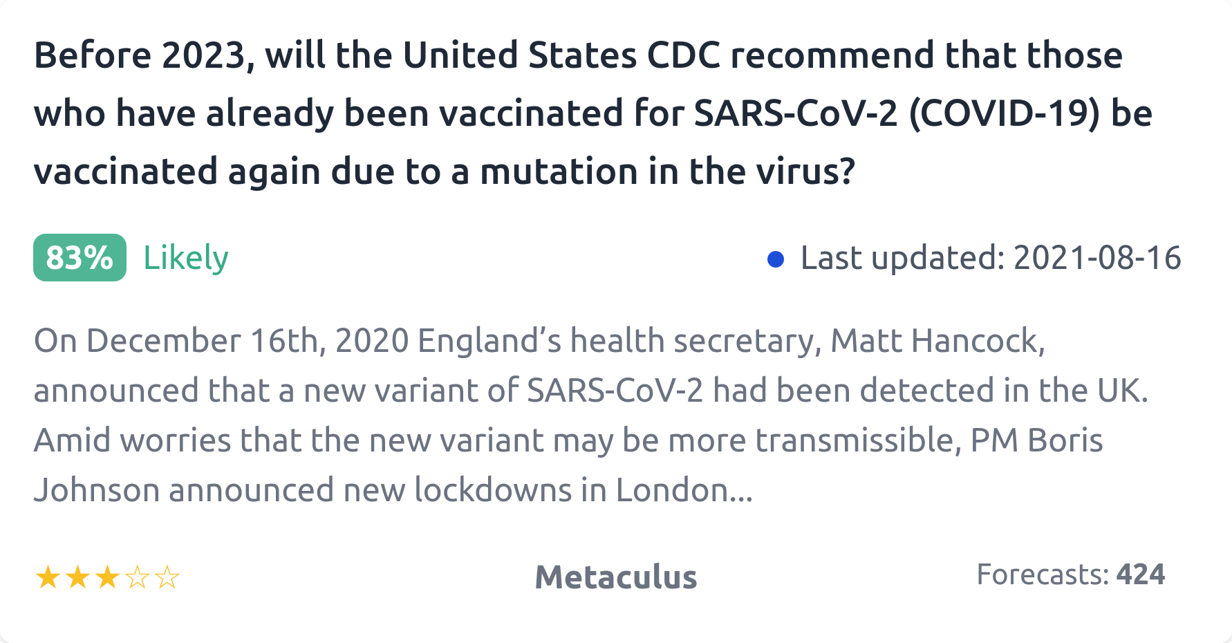 These are taken from Metaforecast, and are provided without comment. To do this yourself, make a search query on Metaforecast, then click on “Capture” on the top right corner, then on “Capture image and generate code”.