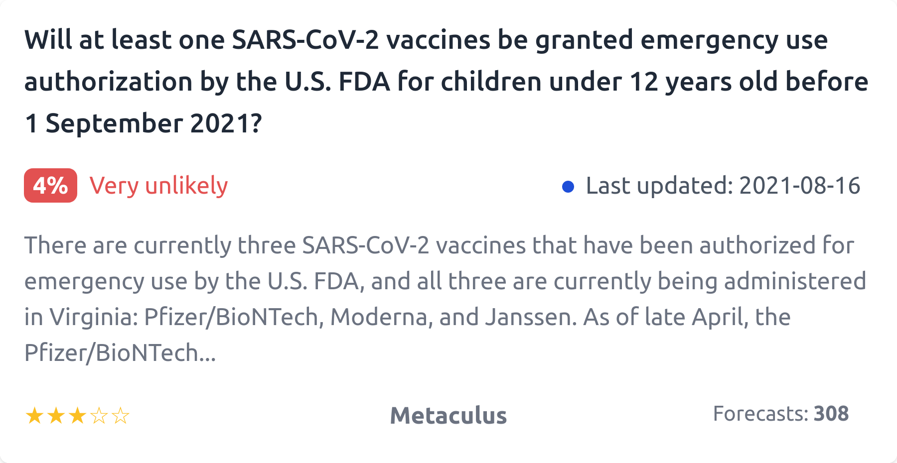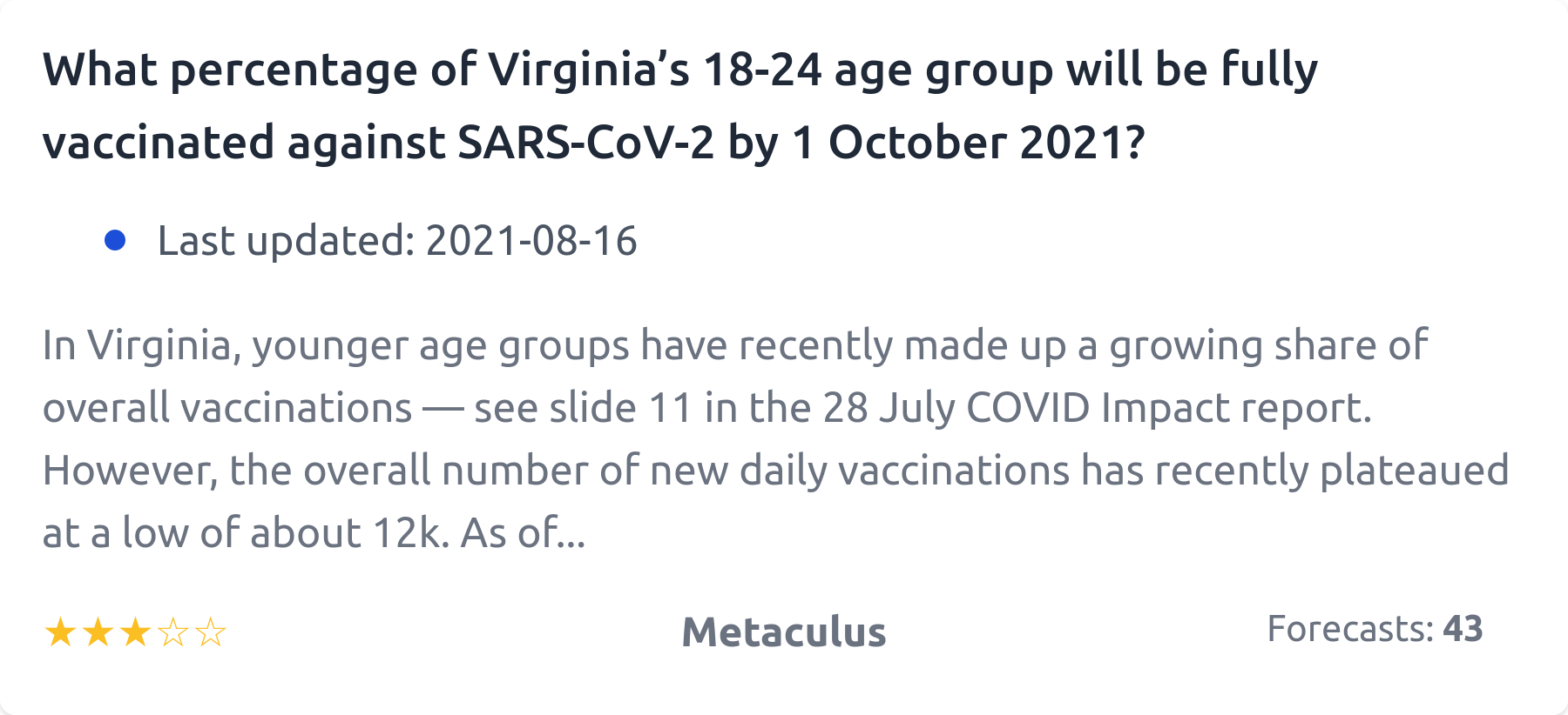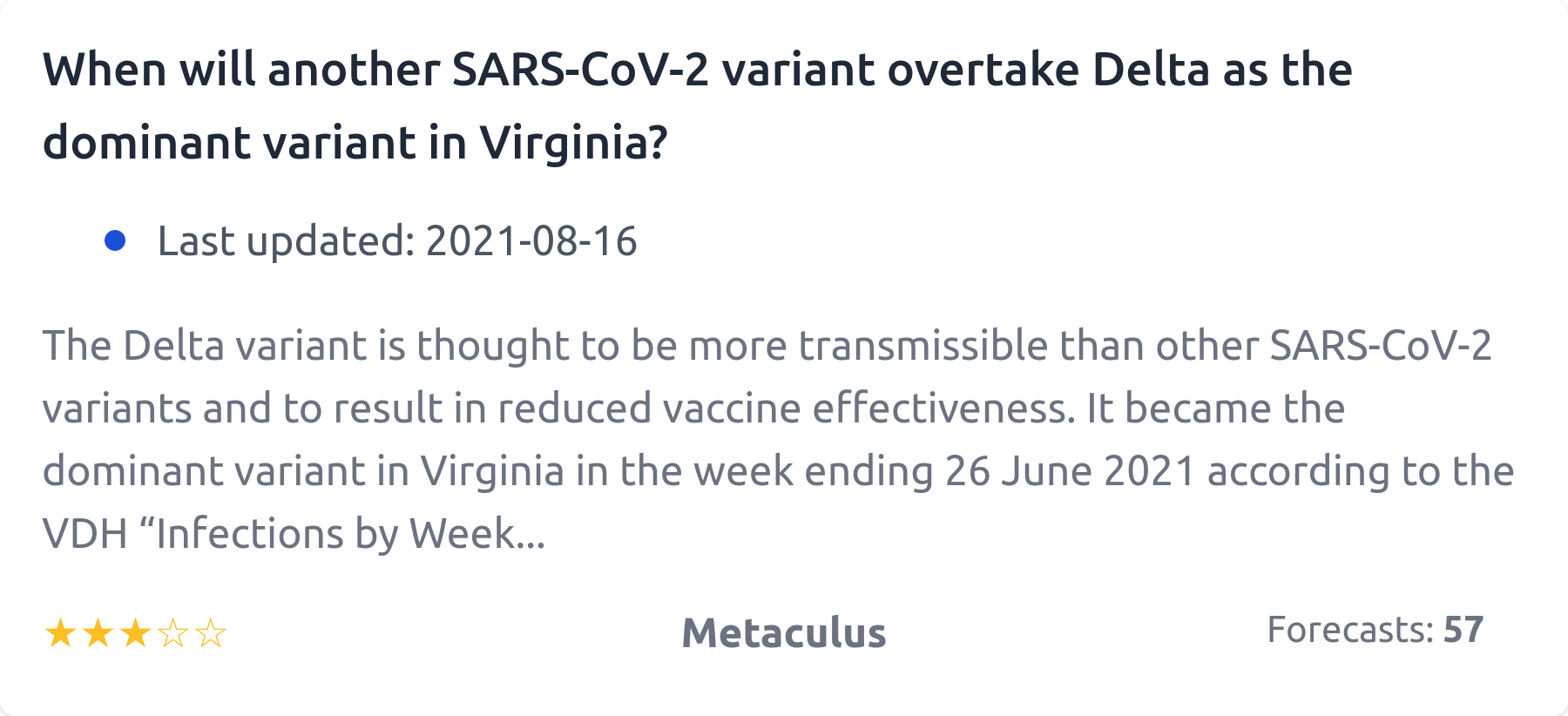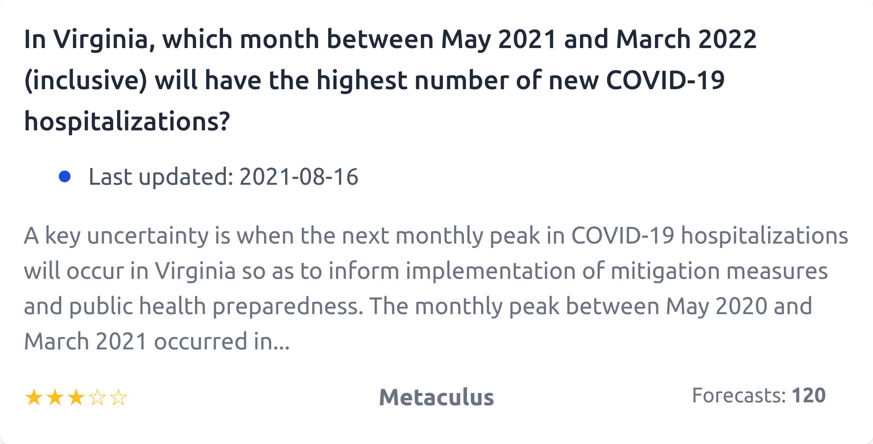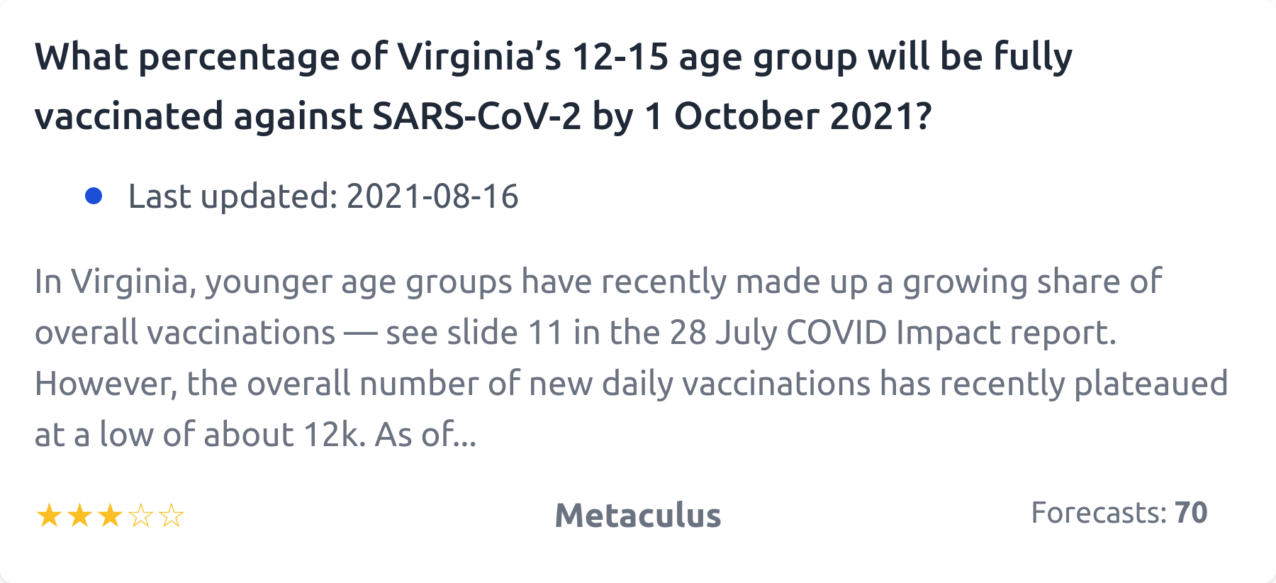 These are taken from Metaforecast, and are provided without comment. To do this yourself, make a search query on Metaforecast, then click on “Capture” on the top right corner, then on “Capture image and generate code”.