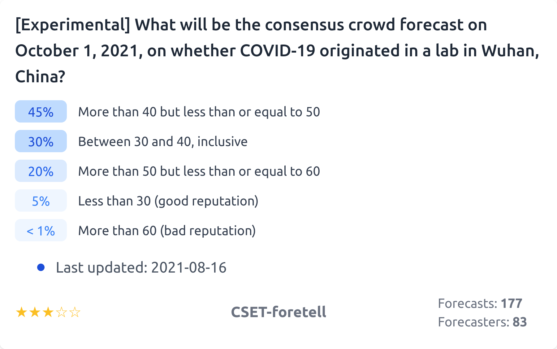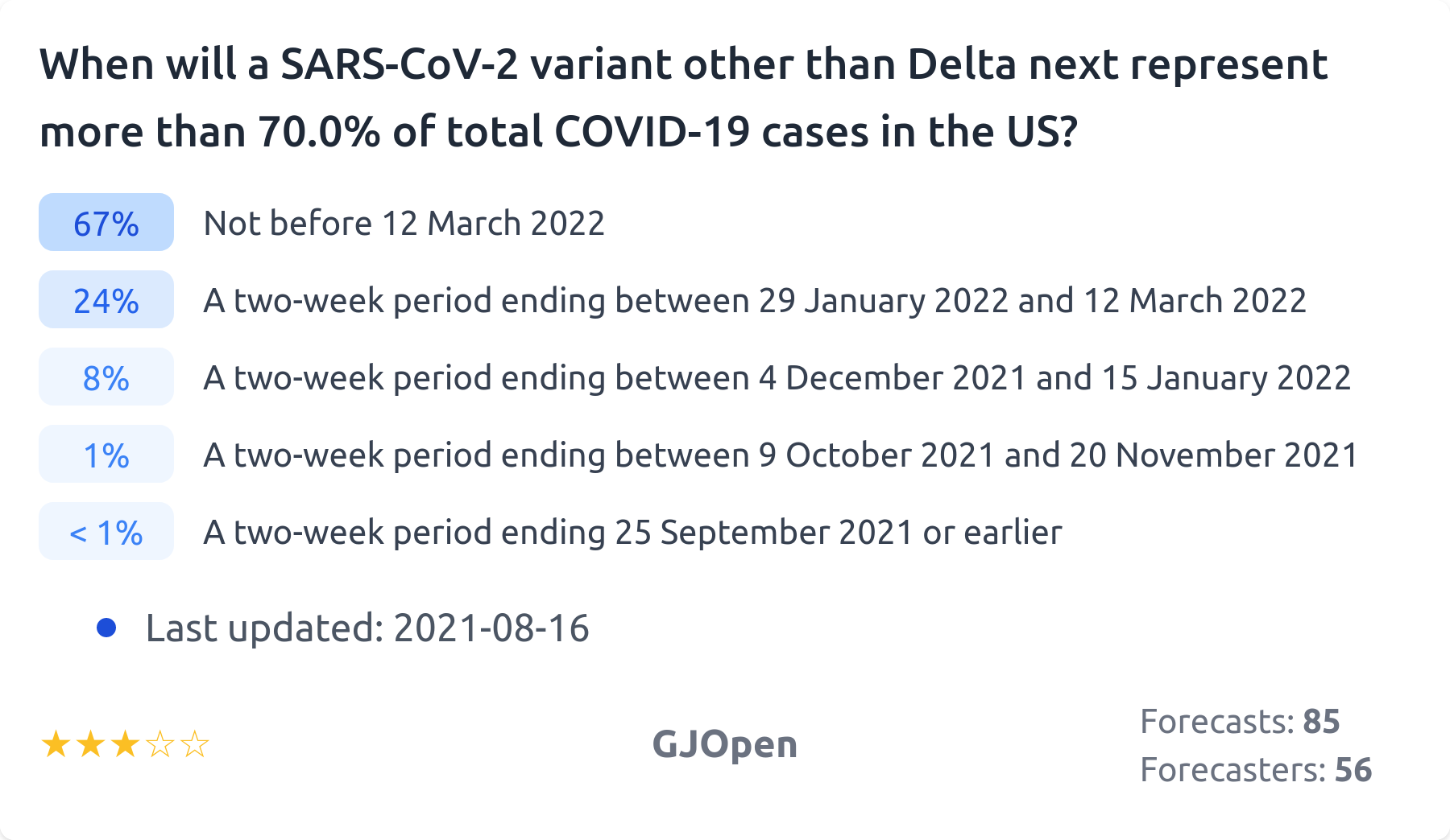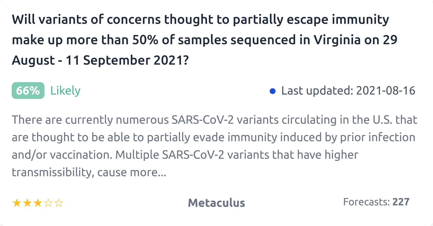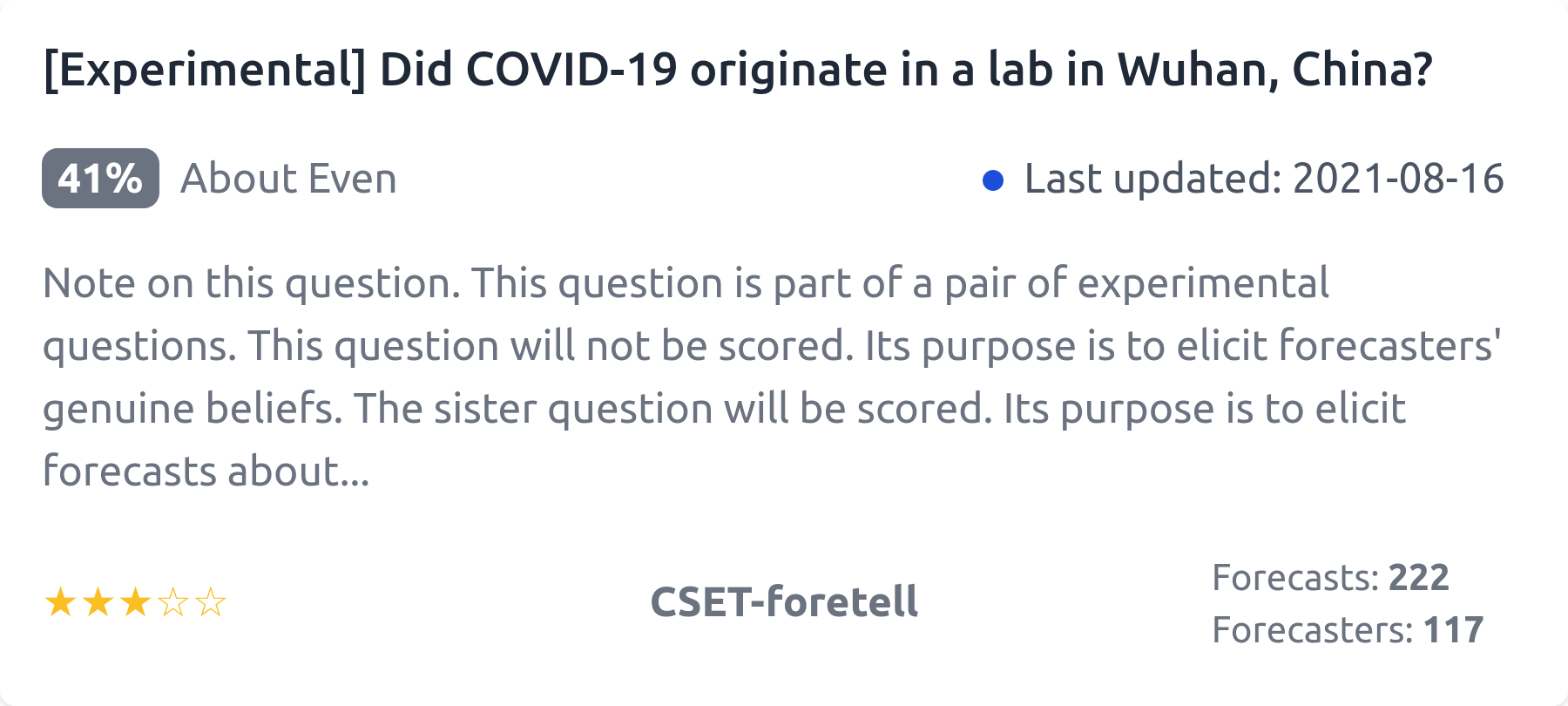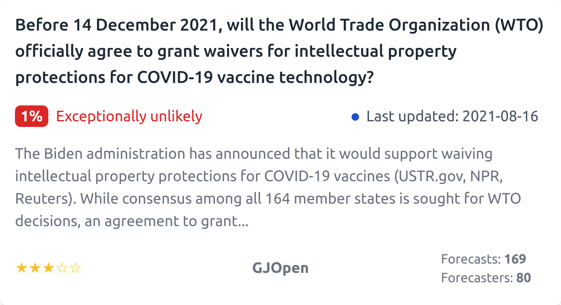 These are taken from Metaforecast, and are provided without comment. To do this yourself, make a search query on Metaforecast, then click on “Capture” on the top right corner, then on “Capture image and generate code”.