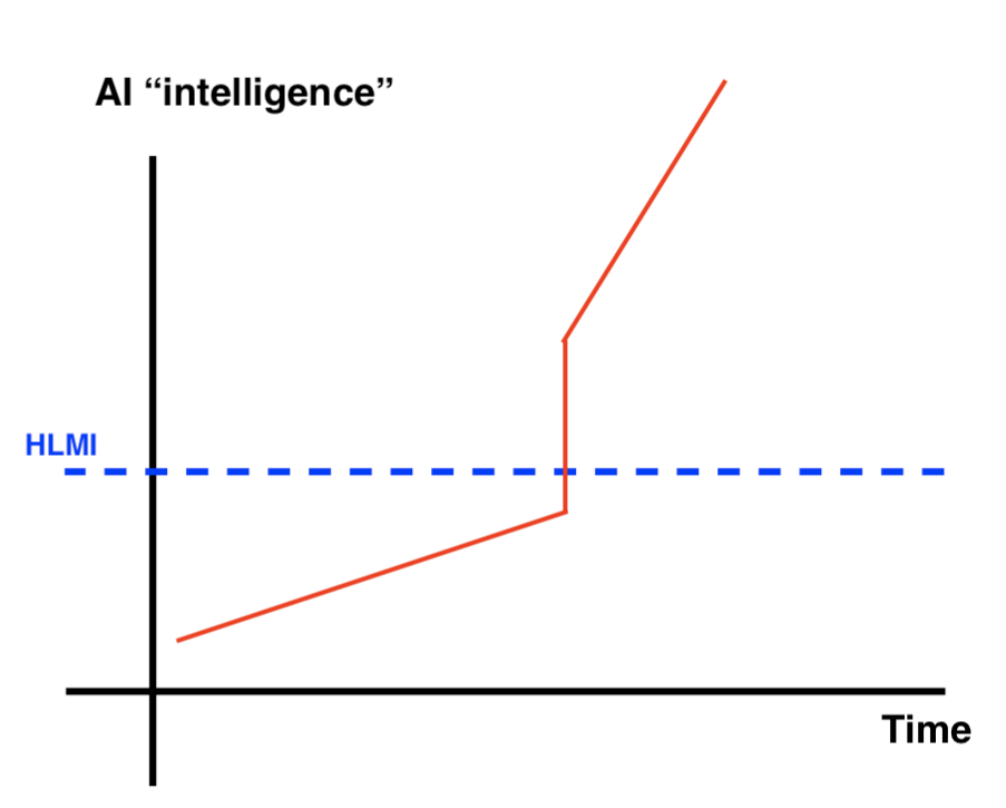 Such a discontinuity could be from a jump in capabilities to HLMI or a jump from HLMI to significantly higher capabilities (or both). A jump in capabilities from HLMI could occur, either if the first HLMI “overshoots” the HLMI-level and is very very capable (which likely depends on both the type of HLMI and whether marginal intelligence improvements are difficult around HLMI), or if a large hardware overhang allows for the first HLMI to scale (in quality or quantity) in such a way that it is far beyond the HLMI-level in capabilities.
