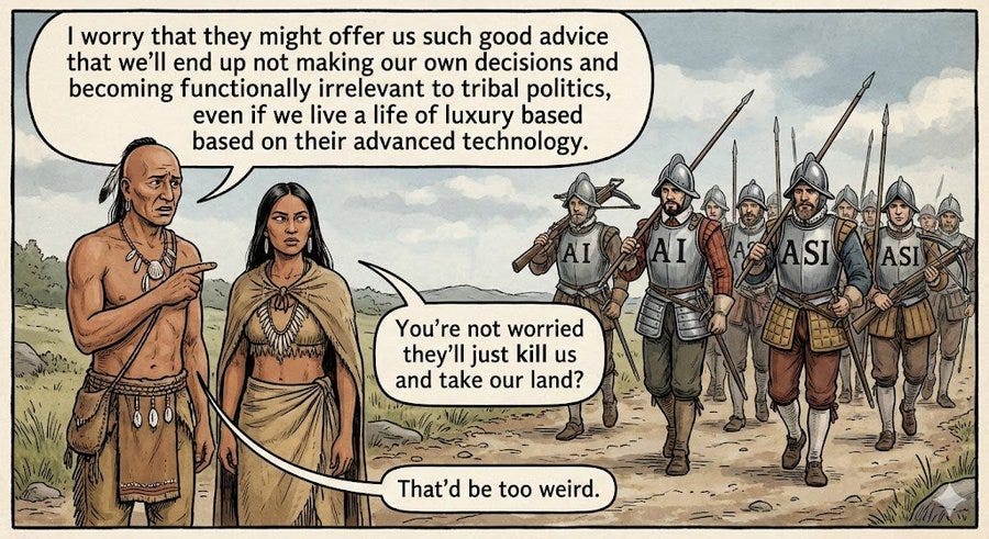 Then, if property rights do hold, did we give AIs property rights, as Guive Assadi suggests (and as others have suggested) we should do to give them a ‘stake in the legal system’ or simply for functional purposes? If not, that makes it very difficult for AIs to operate and transact, or for our system of property rights to remain functional. If we do, then the AIs end up with all the capital, even if human property rights remain respected. It also seems right to at some point, if the humans are not losing their wealth fast enough, to expect AIs coordinating to expropriate human property rights while respecting AI property rights, as has happened commonly throughout the history of property rights when otherwise disempowered groups had a large percentage of wealth.