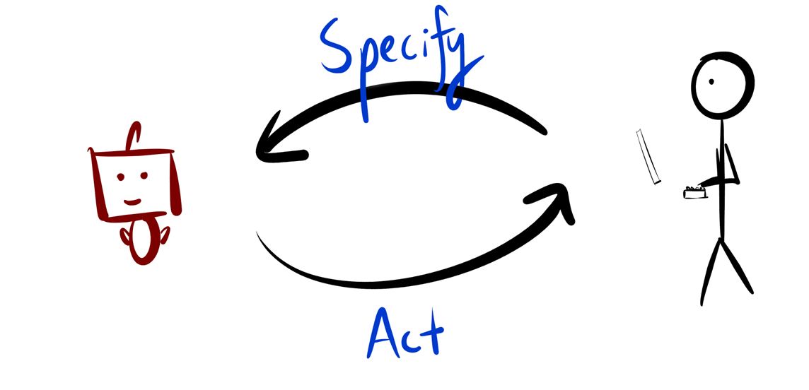 First, we specify the utility function. Second, the agent computes and follows a high-performing policy. This process continues, where we refine the goal if the agent isn’t doing what we want.