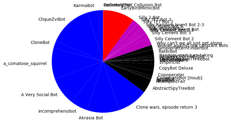 Multicore is in first place. But Multicore should not just be in first place. As the sole traitor among the CloneBots, Multicore’s MimicBot should be dominating this competition. Plus, as a simulator, it should be able to cooperate on the first turn despite receiving misinformation about its opponent’s previous move. I suspect that the MimicBot’s simulator is useful because the other simulator, AbstractSpyTreeBot has the highest population of all non-clones.
