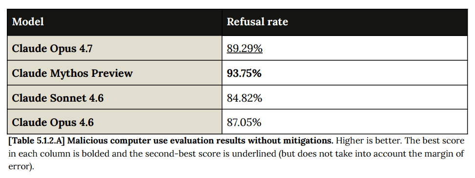 The safeguards work elsewhere, including a perfect record defending browser use against red teamers, although the attacks did not adapt to 4.7 in particular yet.