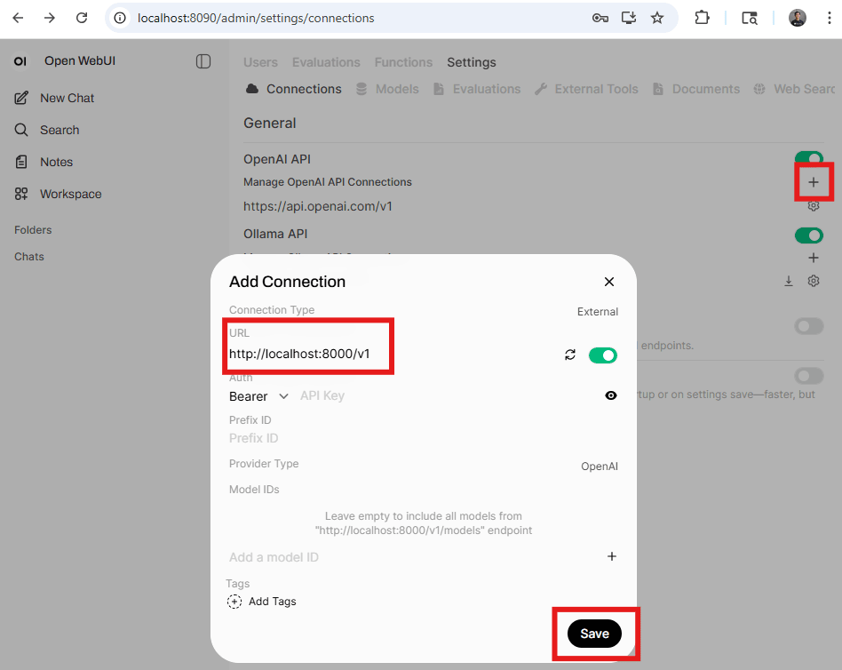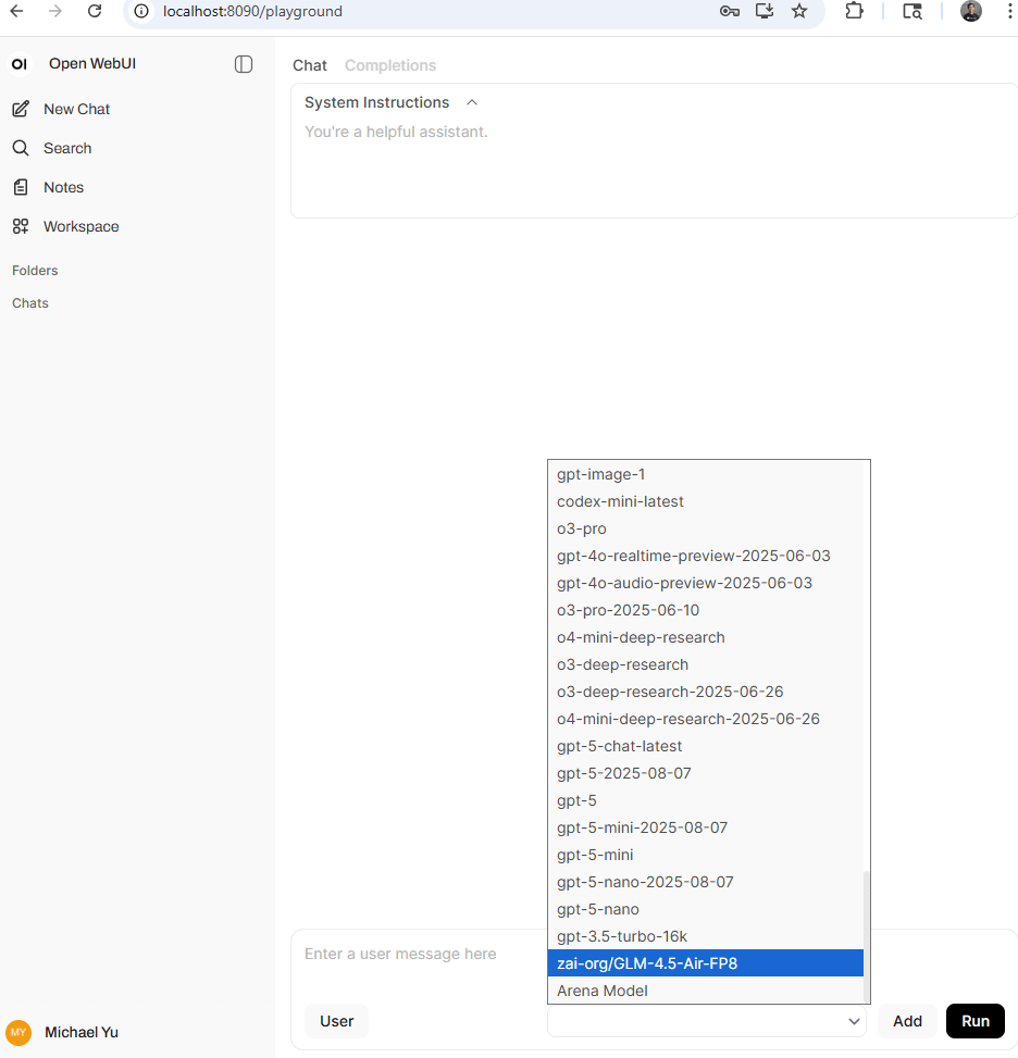 If the local model doesn’t show up, go to /admin/settings/connections and manually add the vllm endpoint.