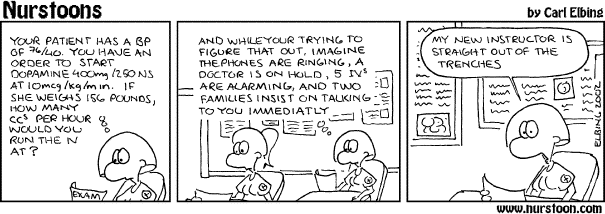 My preceptor, who hates this. “She needs to continue to work on her critical thinking when it comes to caring for critically ill patients,” she wrote on my evaluation. “She knows the theory, and is now working to apply it to ICU nursing.” Shorthand for, she knows the theory, but getting her to apply it to ICU nursing is like pulling teeth. A number of our conversations have gone like this: