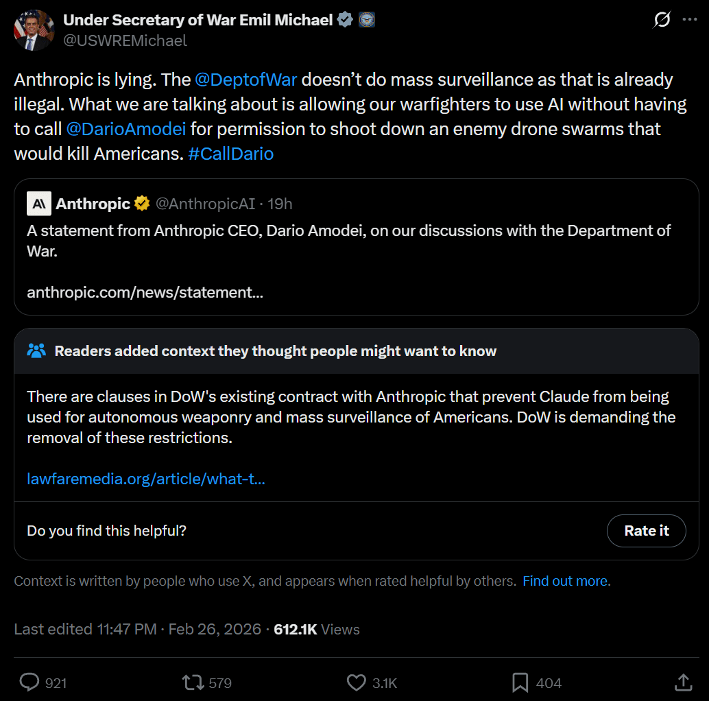 Under Secretary of War Emil Michael: Anthropic is lying. The @DeptofWar doesn’t do mass surveillance as that is already illegal. What we are talking about is allowing our warfighters to use AI without having to call @DarioAmodei for permission to shoot down an enemy drone swarms that would kill Americans. #CallDario