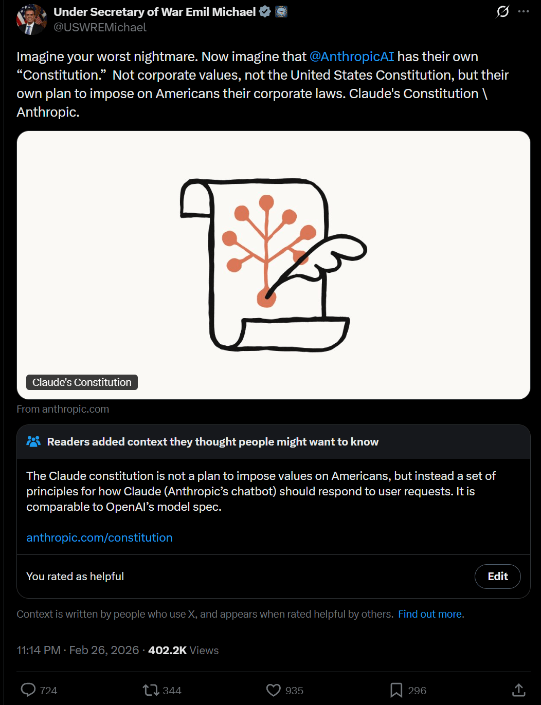 Under Secretary of War Emil Michael: Imagine your worst nightmare. Now imagine that @AnthropicAI has their own “Constitution.” Not corporate values, not the United States Constitution, but their own plan to impose on Americans their corporate laws. Claude’s Constitution \ Anthropic.