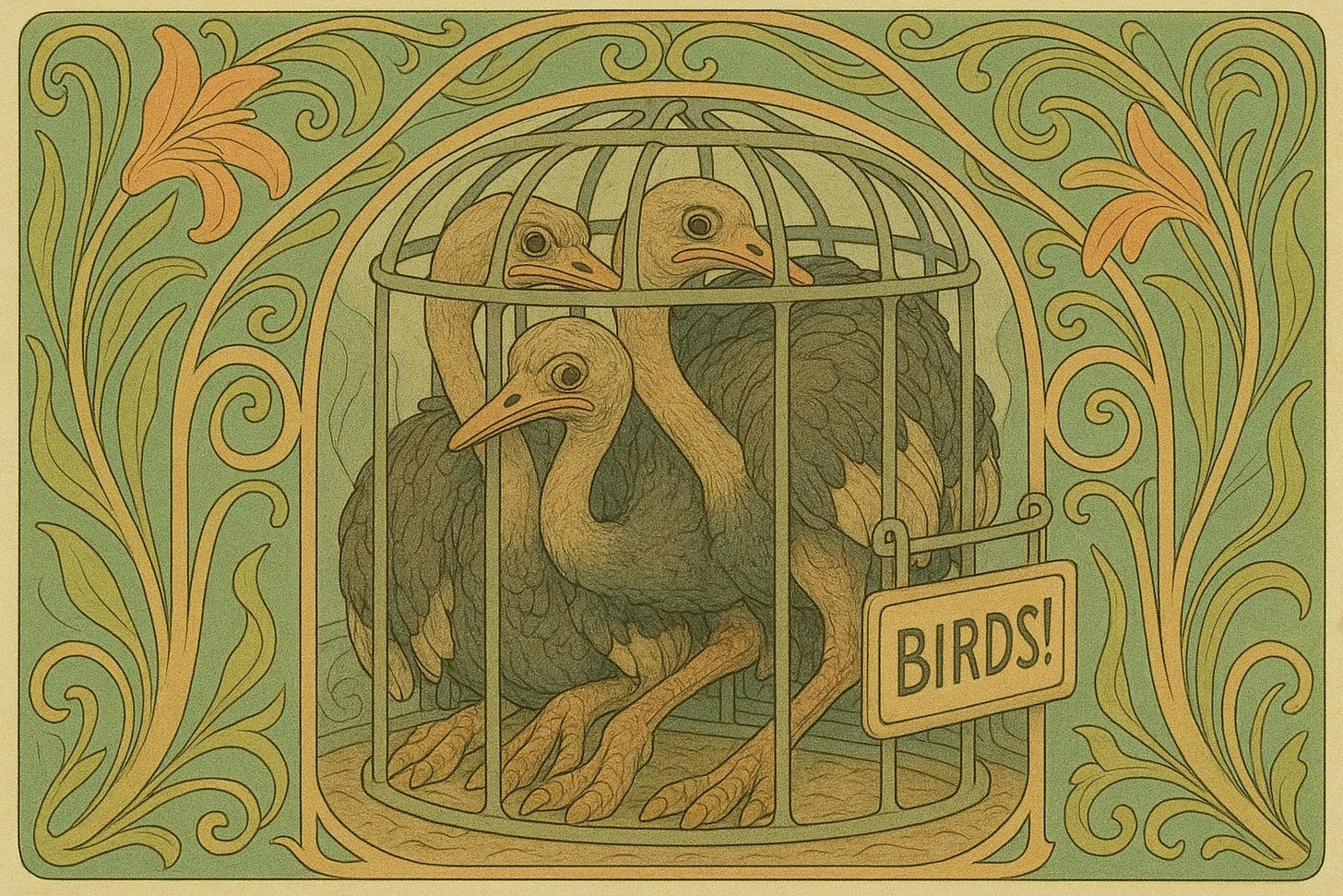 Your boss is not having it, however. When you inform him of your decision to eschew the ceiling enclosure, he gets beet-red and apoplectic, repeating like a mantra “But they’re birds! BIRDS!” and insists that ostriches belong in the aviary with the finches and parrots. I mean, he’s taxonomically correct (the best kind of correct) that ostriches are indeed birds, but it’s also apparent that he’s using the “bird” sticker as a fallacious shortcut to sneak in all sorts of nonsensical assumptions.