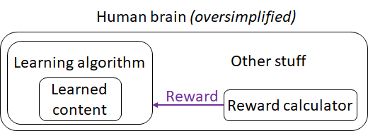 Maybe we’ll make an AGI that has some resemblance to this system. Actually, I should be more specific: Maybe we’ll make an AGI with this general structure, in which the learning algorithm component has some principles in common with the human brain’s learning algorithm component. (The “reward calculator” and “other stuff” will obviously not be human-brain-like in any detail—unless we’re doing whole-brain-emulation which is a different topic—since AGIs don’t need to regulate their heart rate, or to have instinctive reactions to big hairy spiders, etc.)