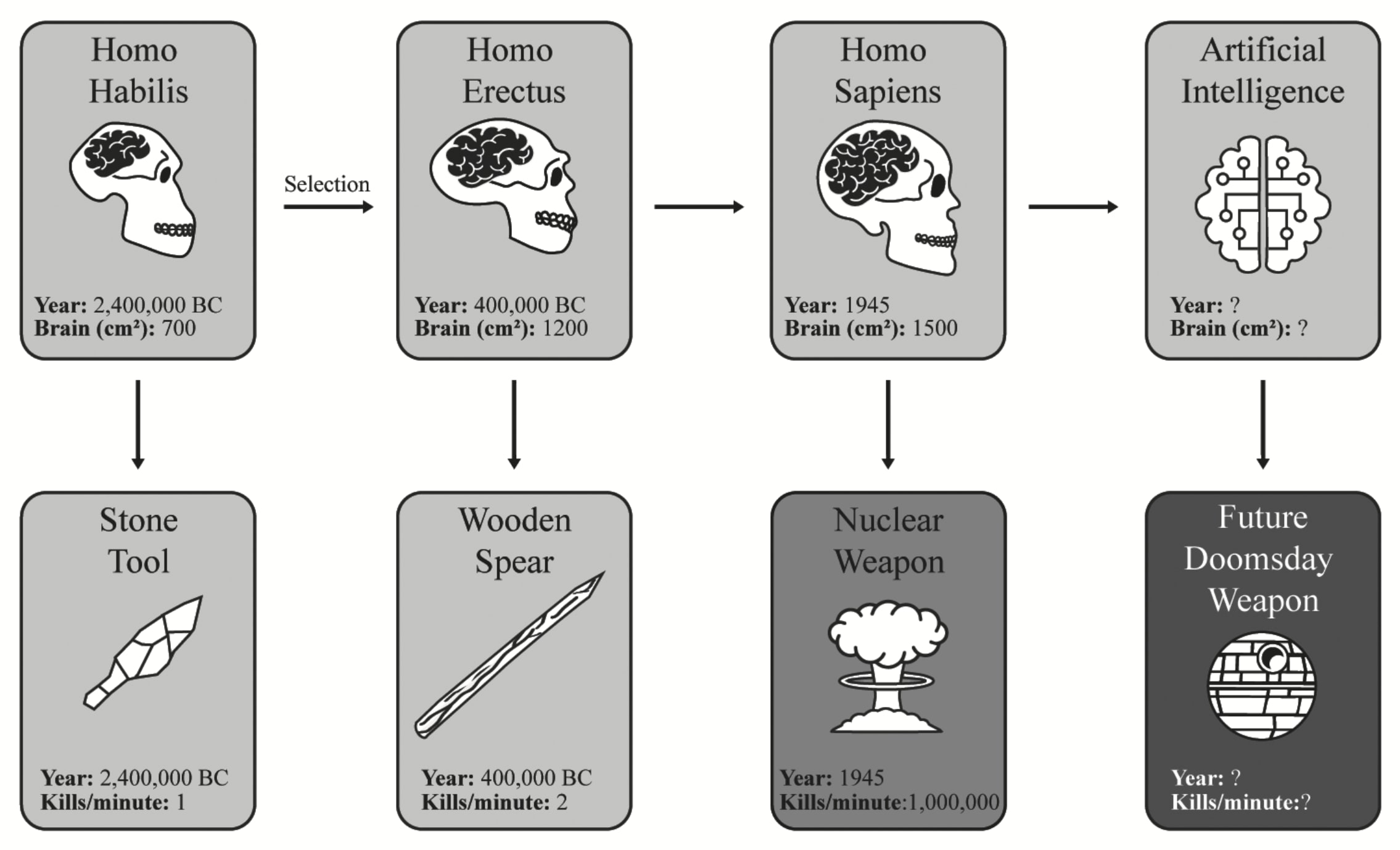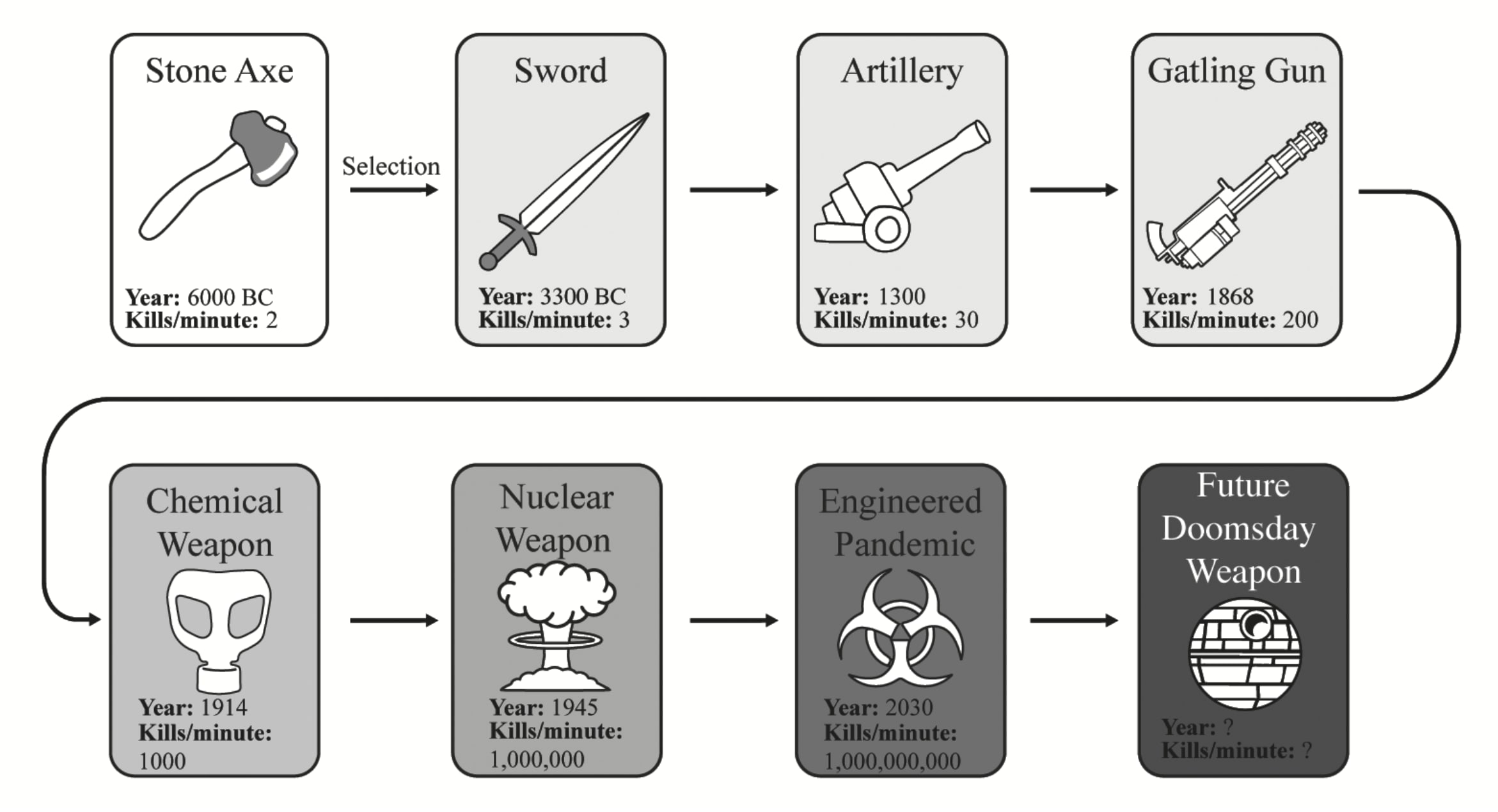 Worse still, global competition for resources makes it advantageous to produce ever more powerful weapons. What began with stone axes, capable of killing one person in a minute, has escalated to nuclear bombs, capable of killing billions. This trend predictably led to the genesis of doomsday weapons and continues toward increasingly destructive technologies, such as engineered pandemics.