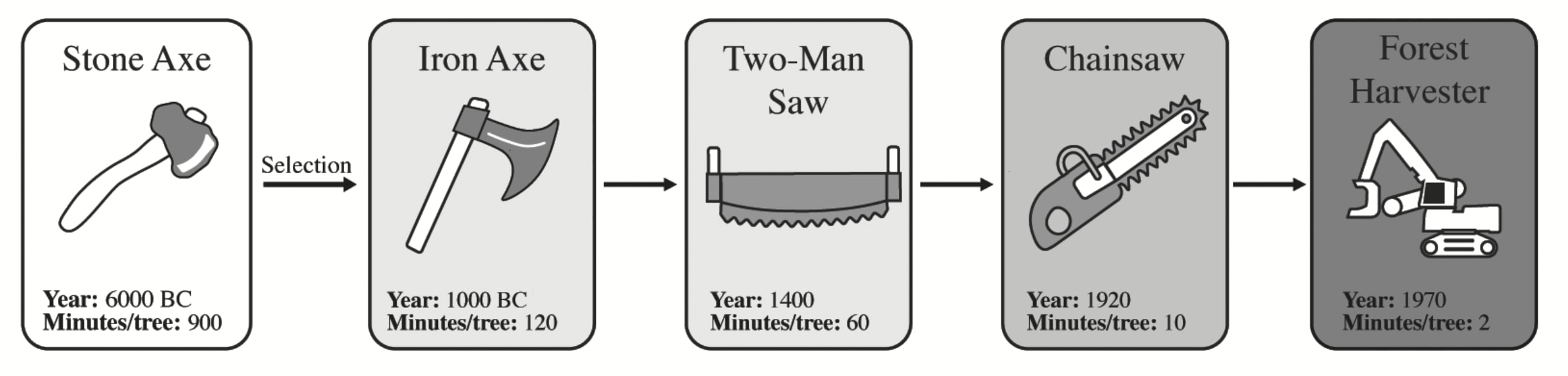 When plotted over time, the impact of these arms races become increasingly evident. Consider the evolution from stone axes, which took days to fell a tree, to modern harvesters that accomplish the task in seconds. Societies that ruthlessly exploit resources grow more powerful, outcompeting those that live in harmony with nature. As a result, nearly half of all species are at risk of extinction within our lifetime.
