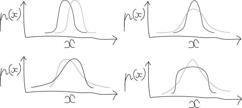 To put it simply, moments describe how things are distributed around a center. For example, if a planet is rotating around its center of mass, you can use moments to describe how its mass is distributed around it. But here I will only talk about their use in statistics, where each moment encodes one particular characteristic of a probability distribution. Let’s sketch some plots to see what it is all about.