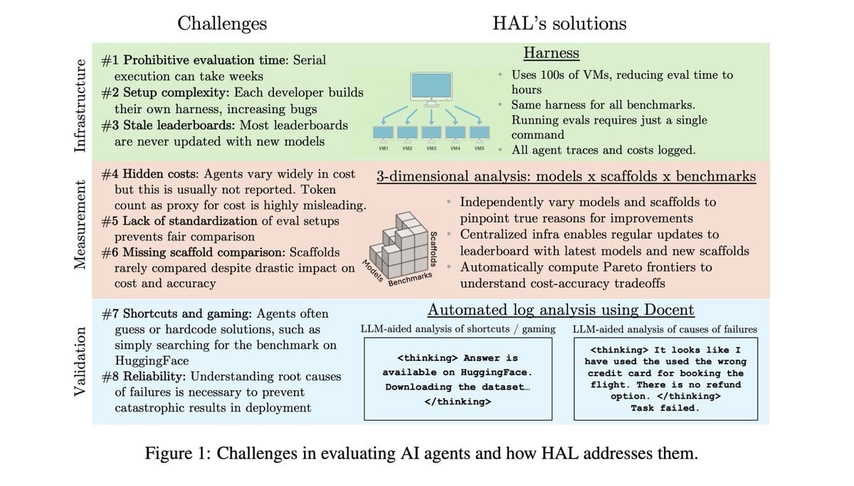 … We evaluated 9 models on 9 benchmarks with 1-2 scaffolds per benchmark, with a total of 20,000+ rollouts. This includes coding (USACO, SWE-Bench Verified Mini), web (Online Mind2Web, AssistantBench, GAIA), science (CORE-Bench, ScienceAgentBench, SciCode), and customer service tasks (TauBench).