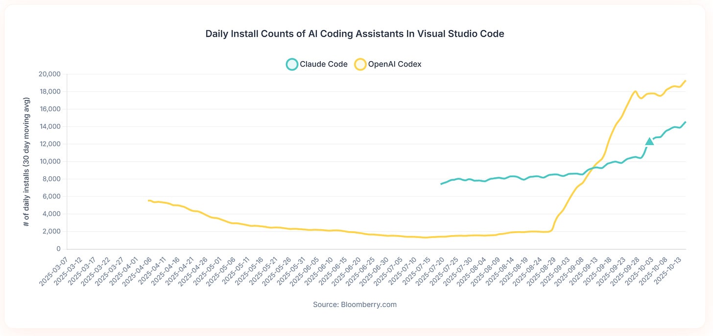 Advanced coding tool installs are accelerating for both OpenAI Codex and Claude Code. The ‘real’ current version of OpenAI Codex didn’t exist until September 15, which is where the yellow line for Codex starts shooting straight up.