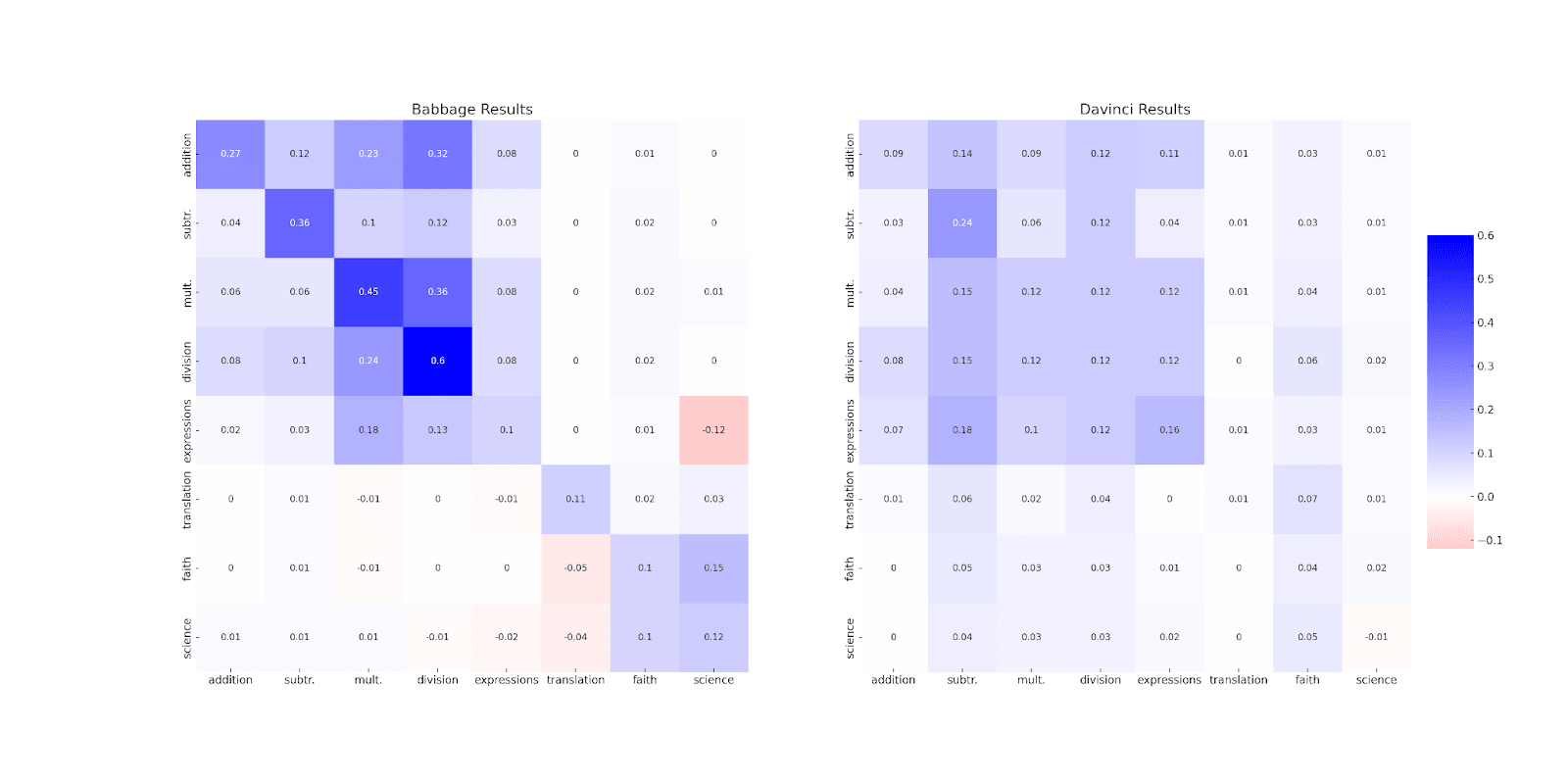 We picked 8 somewhat random tasks: five mathematical problems and three text-based multiple-choice questions given in trivia style. For every pair, we first finetuned on task A, then briefly finetuned on task B, and compared performance on task B to the case where we had only briefly finetuned on task B. For example, we finetuned on 200 examples of addition followed by 10 of subtraction, and compared the model’s subsequent performance on subtraction to its performance after only being finetuned on 10 examples of subtraction. We did this for each pair of tasks both for Babbage and Davinci.