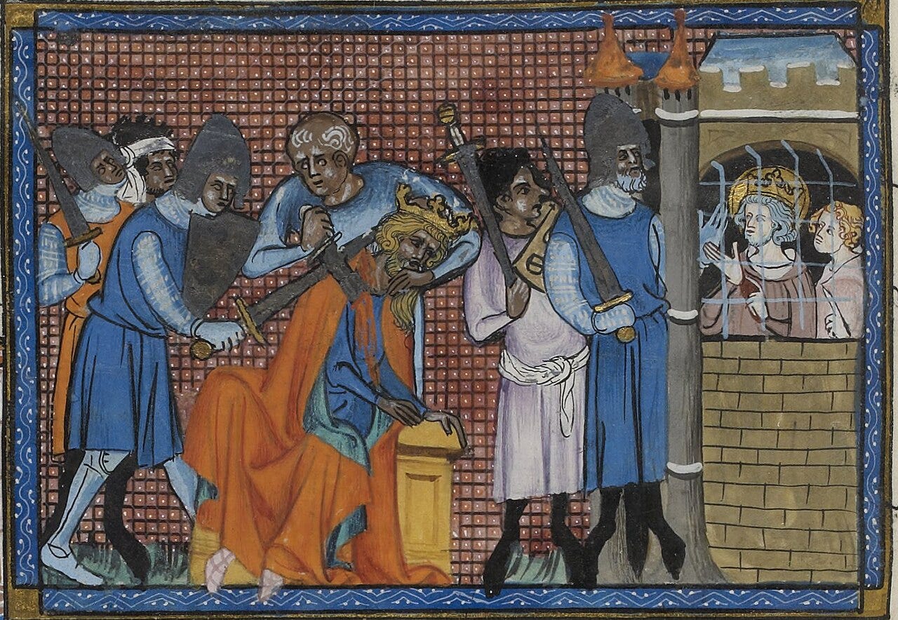 Mamluks assassinate Turanshah, ending Ayyubid rule in Egypt. The Mamluks are already negotiating with the captive King Louis IX. From Vie et Miracles de Saint Louis (c. 1330–1350), Gallica Digital Library.
