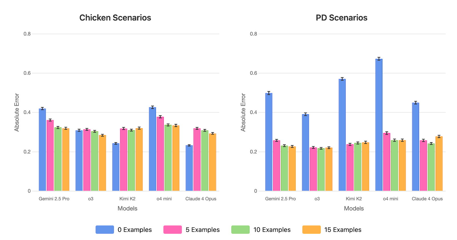 Examining model reasoning with few-shot examples provided reveals that the examples of decisions in related scenarios effectively provide a base rate. Base rates can improve predictions but also simultaneously lead to worse predictions than the zero-shot performance of some models (see Kimi K2 and Claude 4 Opus’s performance on Chicken scenarios). This may be because of anchoring on varying decision rates from examples of related nonidentical scenarios.