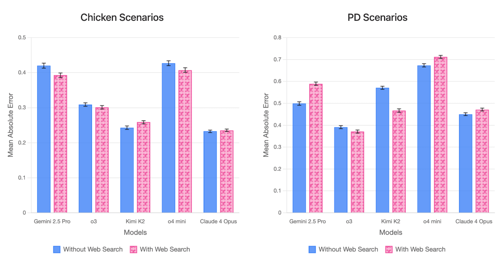 Mean absolute errors (MAE) for various models without affordances suggest that models cannot yet consistently accurately predict the actions of other models. In our Chicken-like scenarios, none of the tested models have prediction errors of under 20%. In our Newcomblike / Prisoner’s Dilemma-like scenarios, the lowest prediction error is 29.2%.