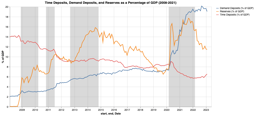Time Deposits, Demand Deposits, and Reserves as a Percentage of GDP (2008-2021)