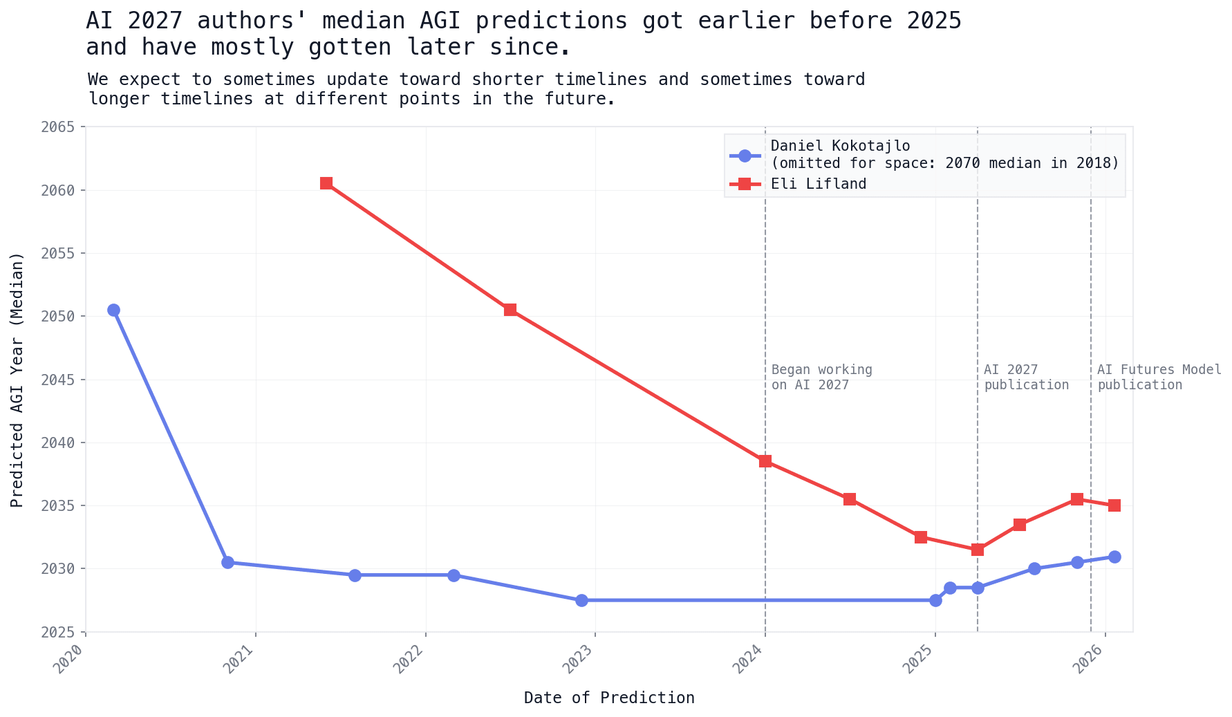 We’ve also made this graph of Daniel and Eli’s AGI medians over time, which goes further into the past: