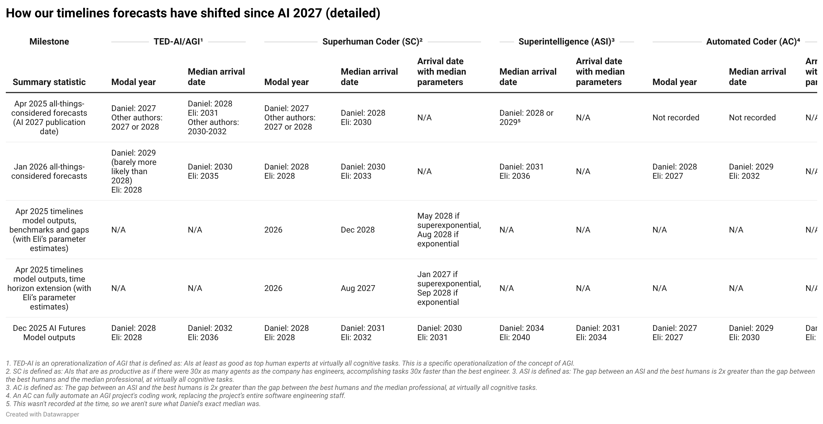 Below we present a comprehensive overview of our Apr 2025 and recent timelines forecasts. We explain the columns and rows below the table. See https://www.datawrapper.de/_/m4PVM/ for the same table but with links to sources for most of the predictions, and larger text.