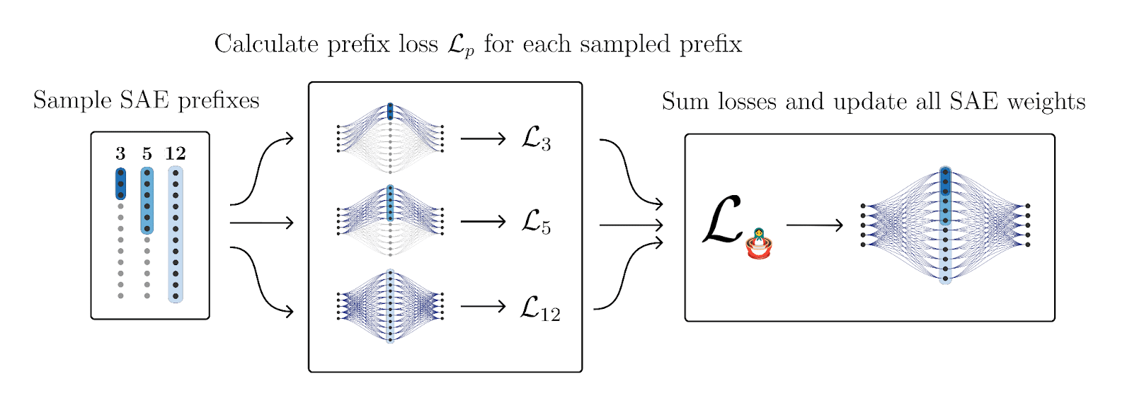Matryoshka SAEs are a novel SAE architecture that encourages a hierarchy among features by using multiple SAE loss terms across different sized subsets of the SAE latents. A Matryoshka SAE with 5 different prefixes is like training 5 different sized SAEs that happen to share the same latents.
