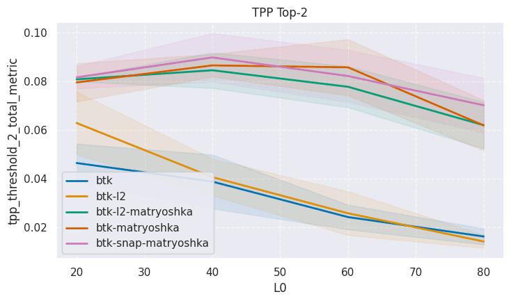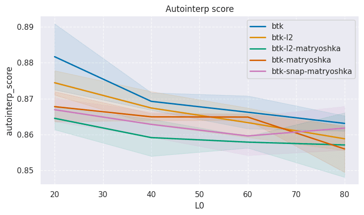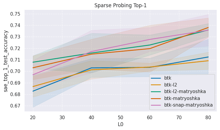 Next, we train 32k width SAEs with L0 20, 40, 60, and 80 and compare SAEBench metrics. We train standard batch topk, batch topk with L2 loss, standard matryoshka, snap loss matryoshka, and L2 loss matroyshka SAEs. These SAEs are all trained on 500M tokens. The Matryoshka SAEs have inner sizes of 128, 512, 2048, and 8192. All SAEs are trained 5 different times with different seeds to estimate variance. In the plots below, the bands around each line correspond to 1 standard deviation. Results are shown below: