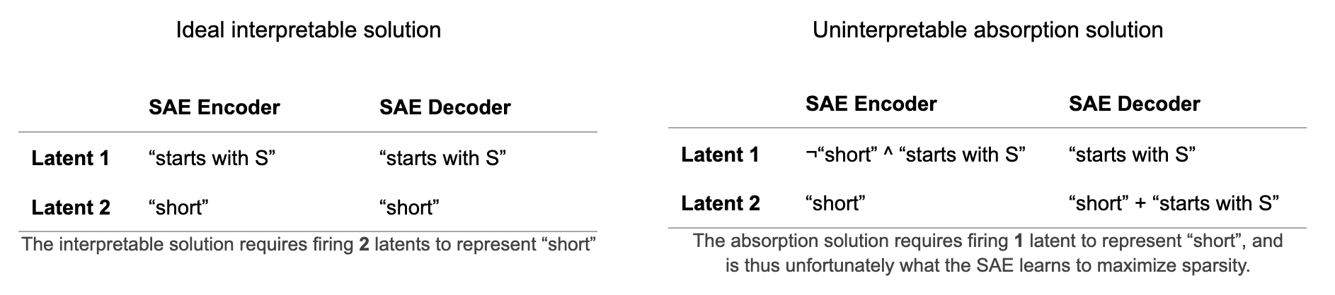 While both feature absorption and feature hedging can be consequences of co-occurring features, the underlying causes and effects of each are very different. The table below summarizes the differences between hedging and absorption.
