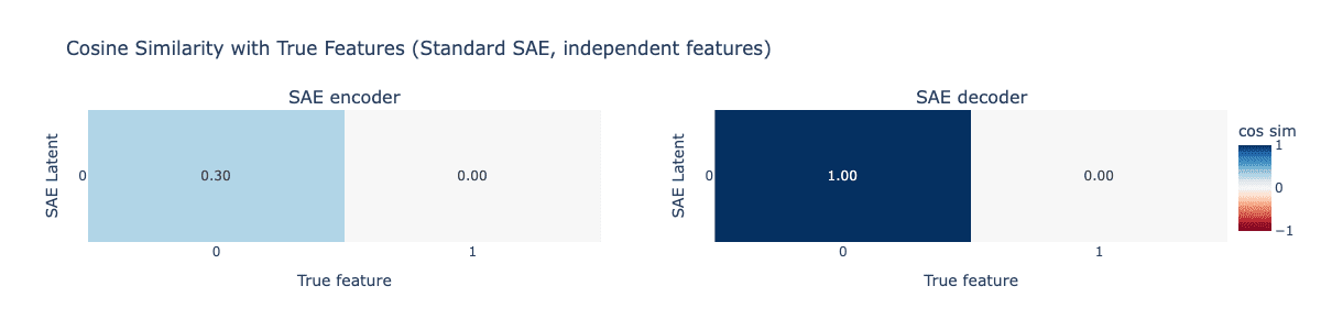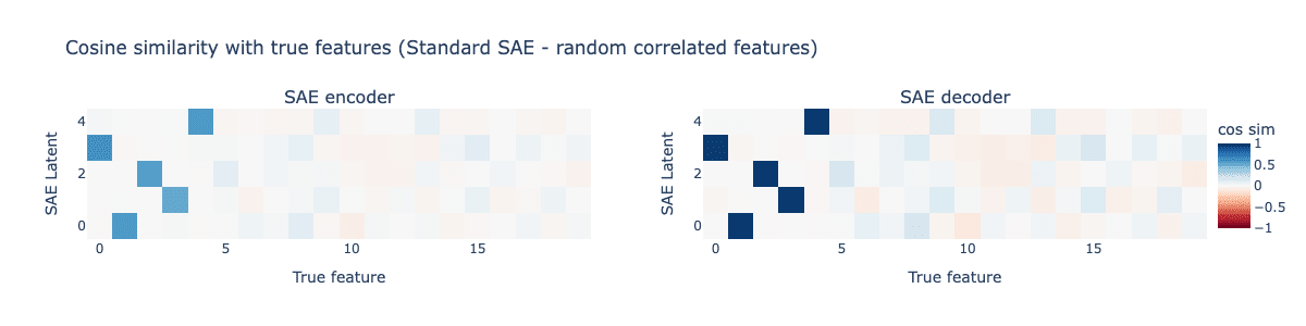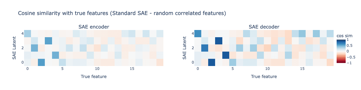 We first train a standard SAE on this toy model. The resulting cosine similarities between the SAE encoder and decoder with the true features is shown below.