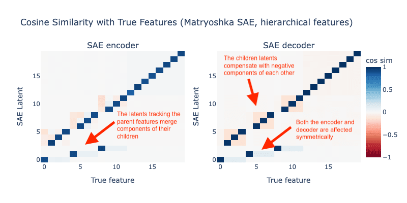However, Matryoshka SAEs are particularly susceptible to feature hedging since narrow SAEs are explicitly used as part of the architecture. The latents in the narrow SAEs track underlying parent features, but due to hedging also pull in components of the corresponding child features as well.