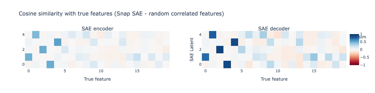 We find that when we use snap loss to train the single-latent SAEs from our toy examples, the SAE perfectly recovers the true feature with no interference, despite hierarchical features, correlated features, or anti-correlated features.