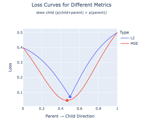 In this case, we have no hope of our SAE latent finding the correct parent latent. Both L2 and MSE loss have a global minimum near the merged solution. Still, it seems unlikely that this situation would be common in reality. For instance, we would expect that a parent feature like “Noun” would not be firing along with any specific noun the vast majority of the time, so we should hopefully expect to find ourselves in the case where L2 loss has a global minimum at the true parent feature in reality.