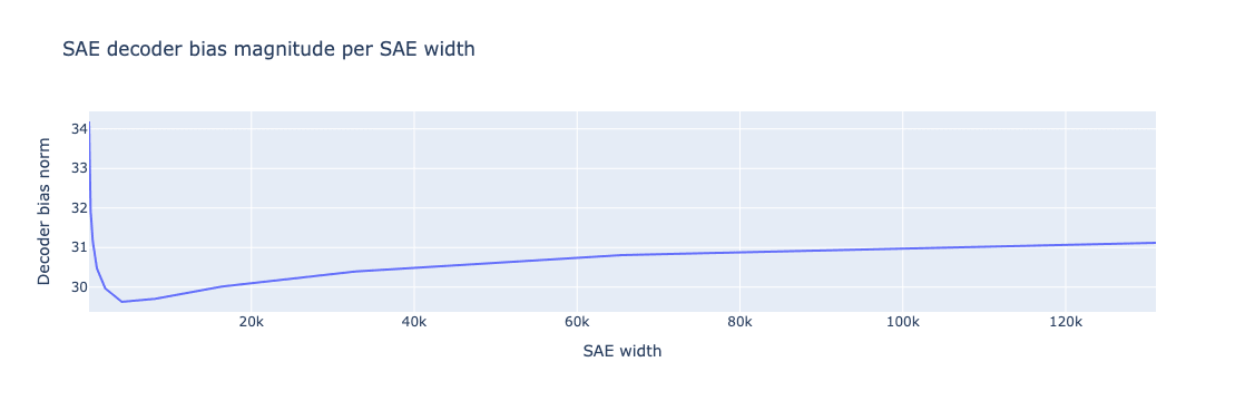 The SAE decoder bias norm begins growing again after width ~2000-4000. The residual stream width of Gemma-2-2b is 2304, so this corresponds with roughly the residual stream dimension. We don’t know what’s going on here, but our best guess is that after enough latents are added, the delta to the decoder bias begins to look more and more like adding a large number of random vectors to the decoder bias. Concentration of measure predicts that the norm of
