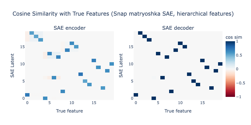 This can be seen in the toy model used in the original Matryoshka SAE work. This toy model involves 20 mutually orthogonal features, with features 0, 4, and 8 being parent features. Features 1-3 are children of feature 0, 5-7 are children of feature 4, and features 9-11 are children of feature 8. The rest fire independently of each other. All child features are mutually exclusive. We train a standard L1 loss matryoshka SAE on this toy model with 3 levels of width 3, 12, and 20. The resulting encoder and decoder cosine similarity with the underlying true features is shown below.